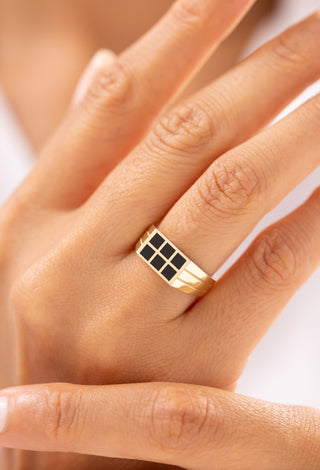 Şık ve Modern Siyah Kare Desenli 14 Ayar Altın Yüzük