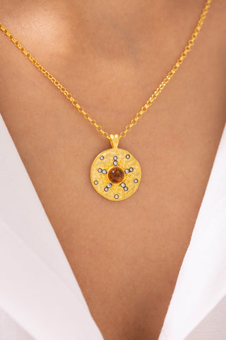 Turuncu Taşlı Antik Güneş 14 Ayar Altın Kolye