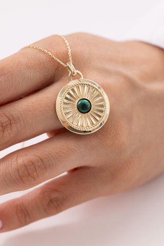 Zümrüt Renkli Taşlı Vintage Güneş 14 Ayar Altın Kolye