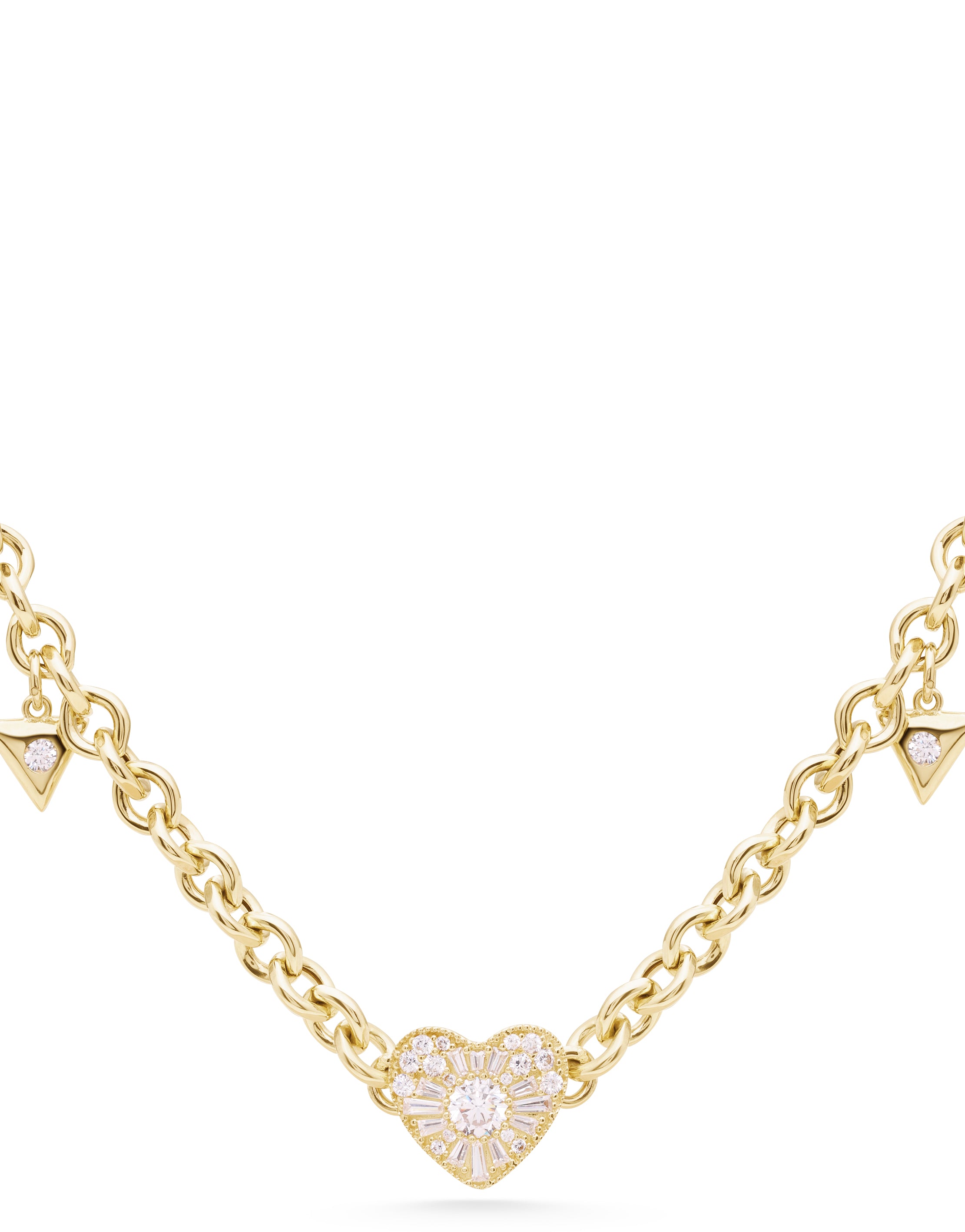 Ortasında yer alan kalp formu, parıltılı taşlarla çevrelenmiş ışıltılı bir merkez oluştururken, choker tarzındaki zincir modern bir güç ve zarafet hissi verir.