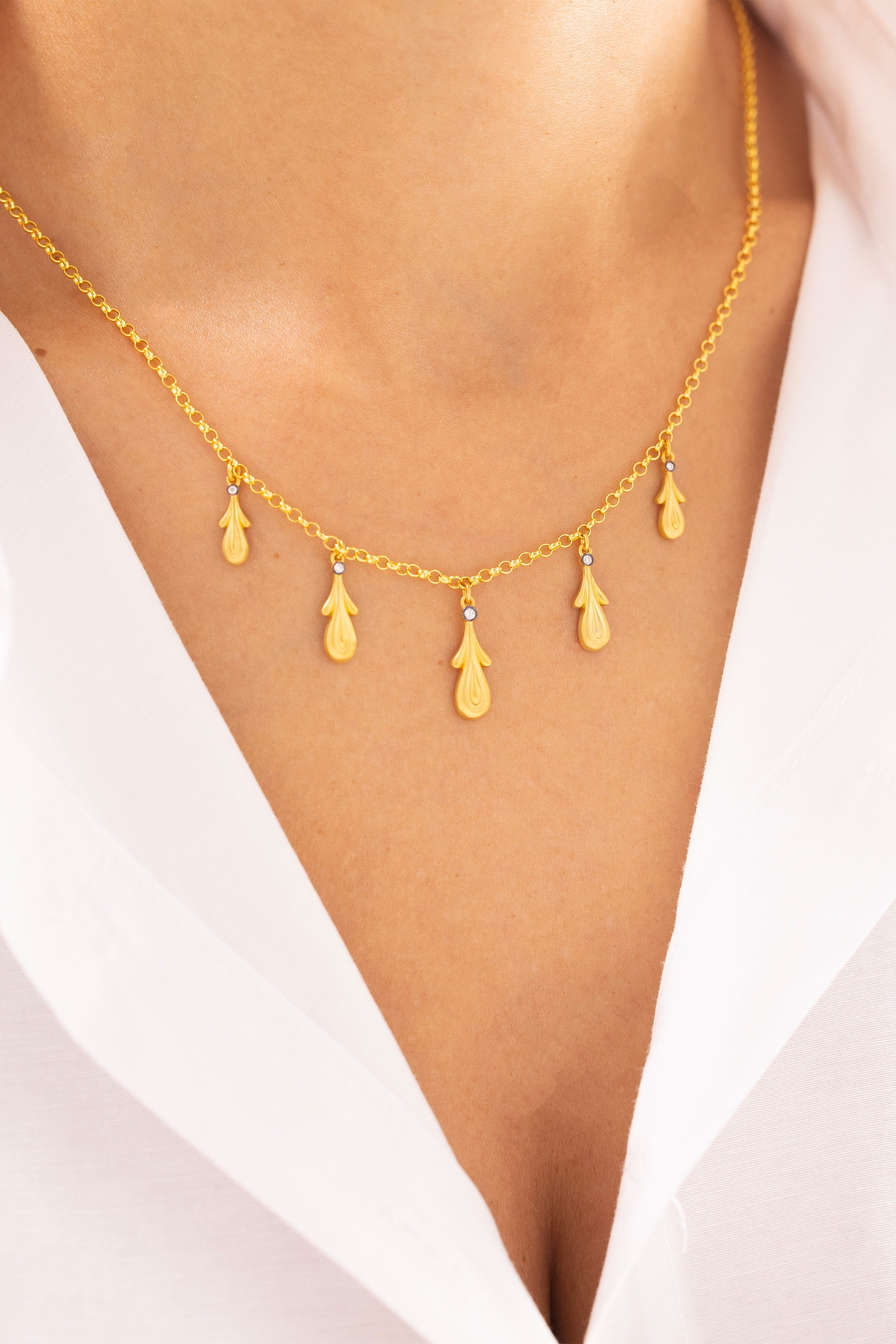 Antik Dokulu Damla 14 Ayar Altın Kolye, geçmişin zarafetini günümüz minimalizmiyle birleştiriyor. Her bir damla motifi, altının doğal sıcak tonuyla işlenerek adeta zamanda asılı kalmış bir güzelliği yansıtıyor.