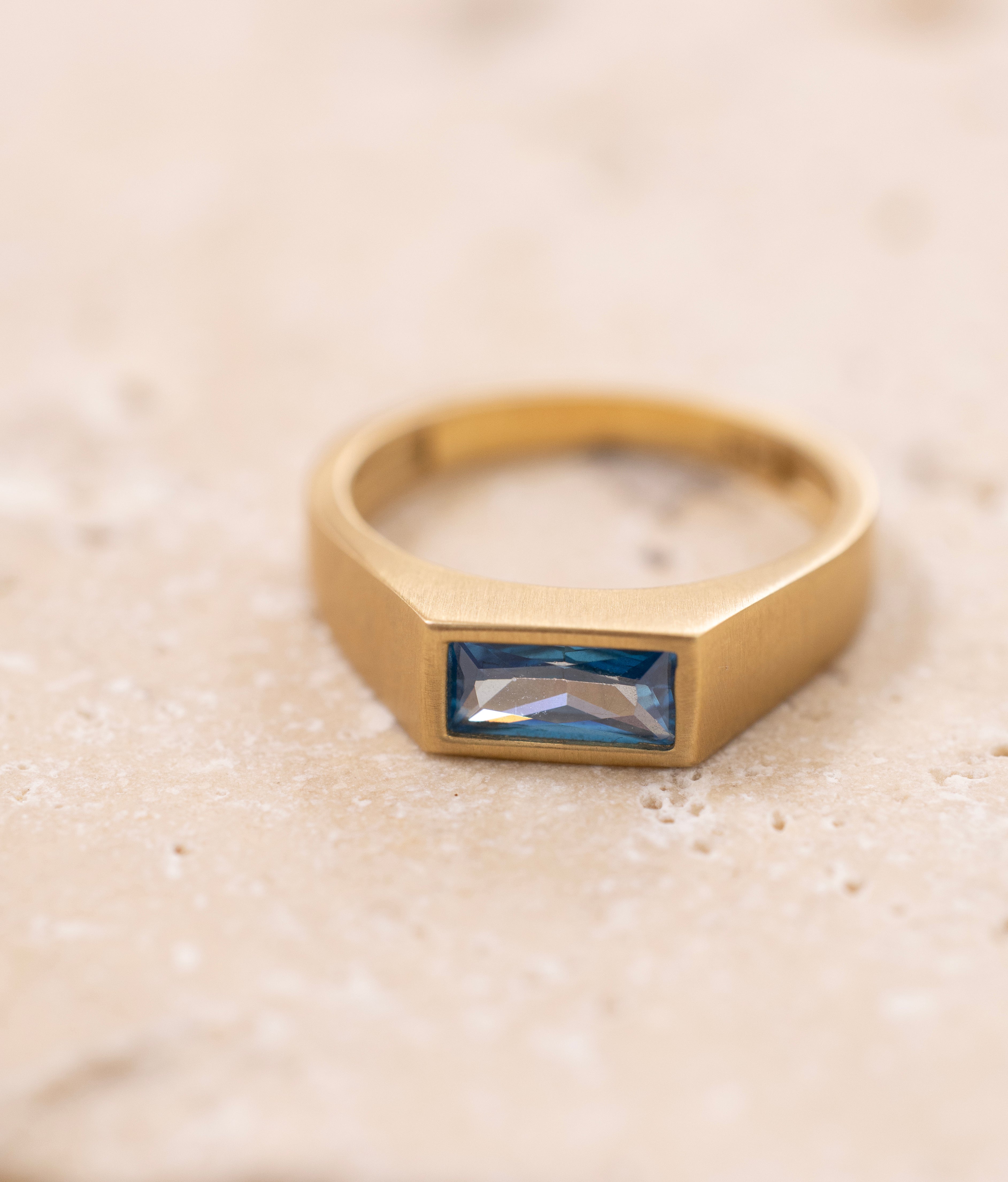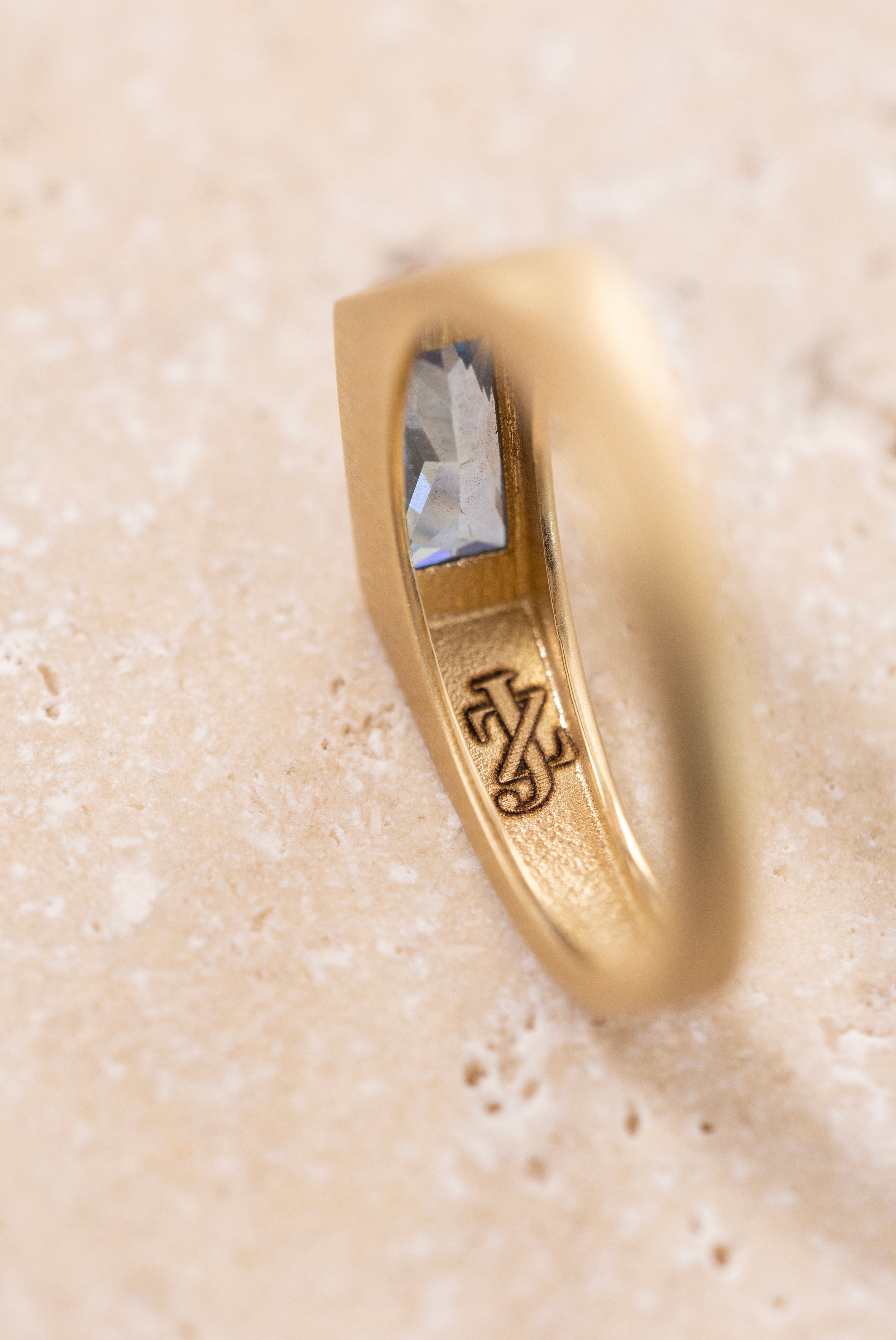İçindeki su tonlarındaki taşlar, duygularla sezgilerin birleşimini simgelerken, keskin hatlı formülü yüzüğe bir zırh hissi katıyor.