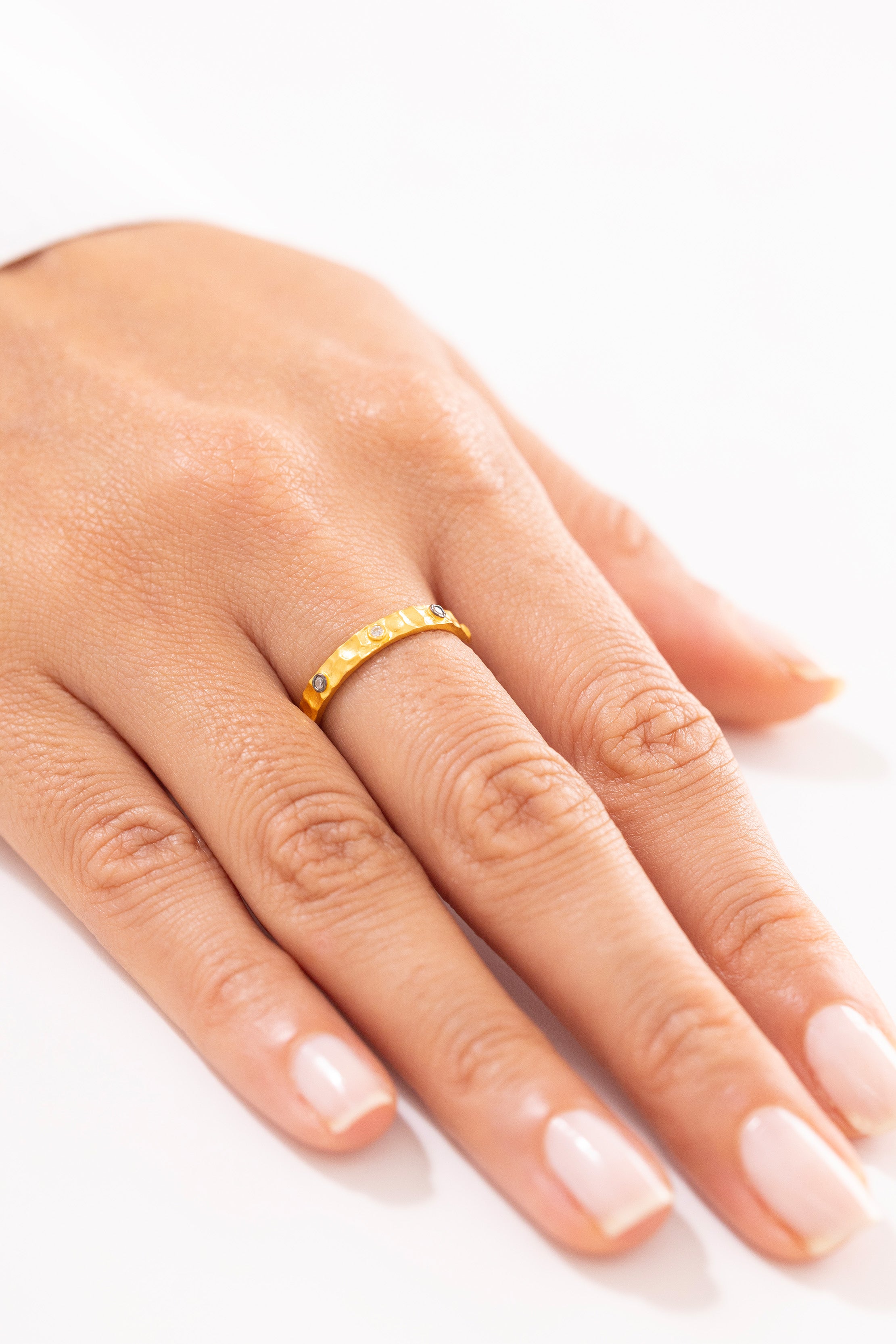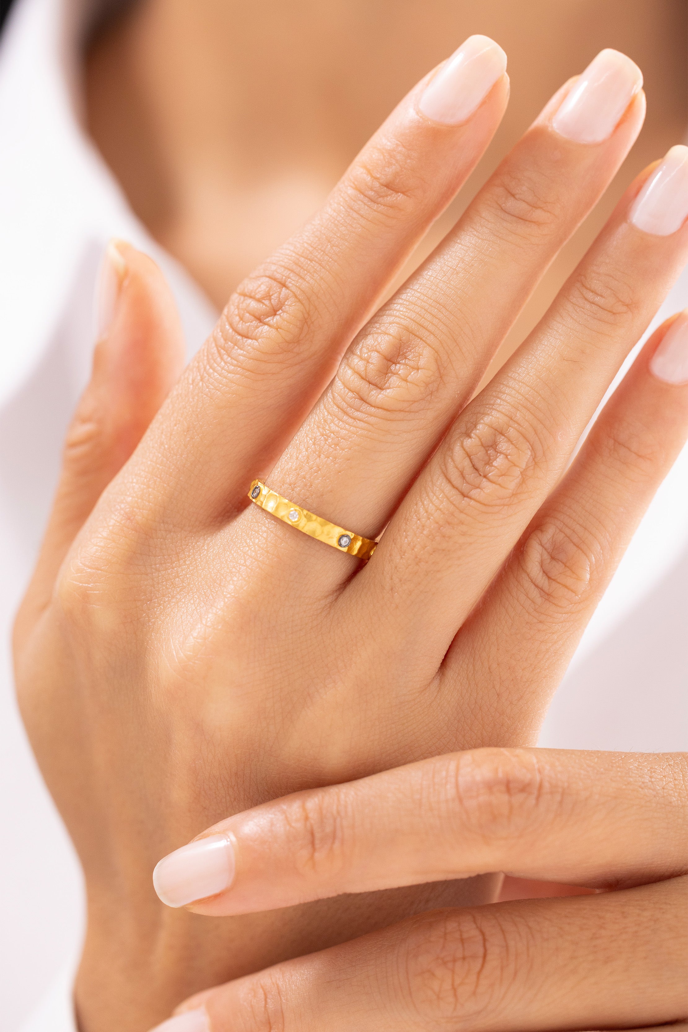 Yüzeyindeki çekiç dokulu mat görünüm, minimal taş detaylarıyla birleşerek zarif ama güçlü bir stil sunar.