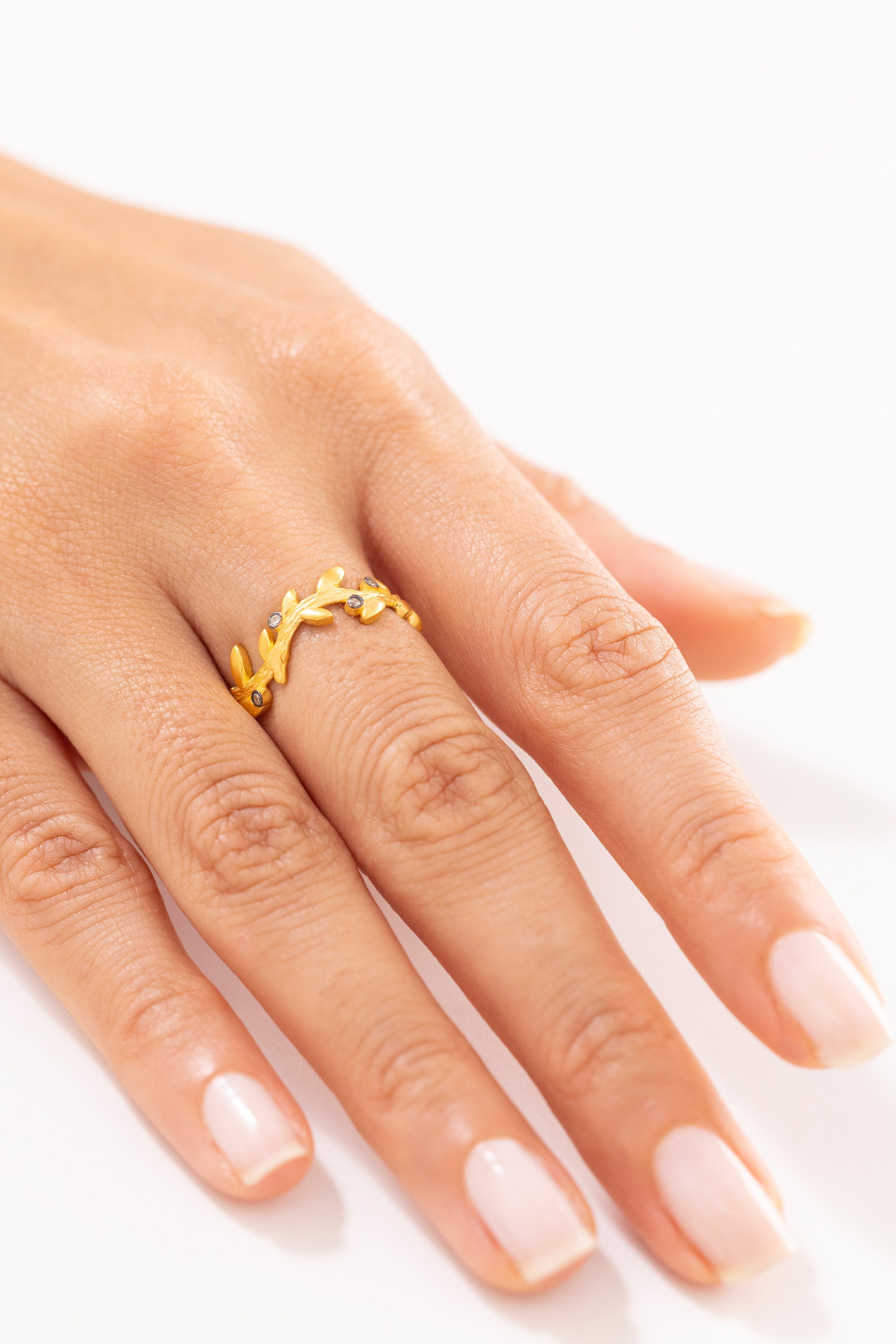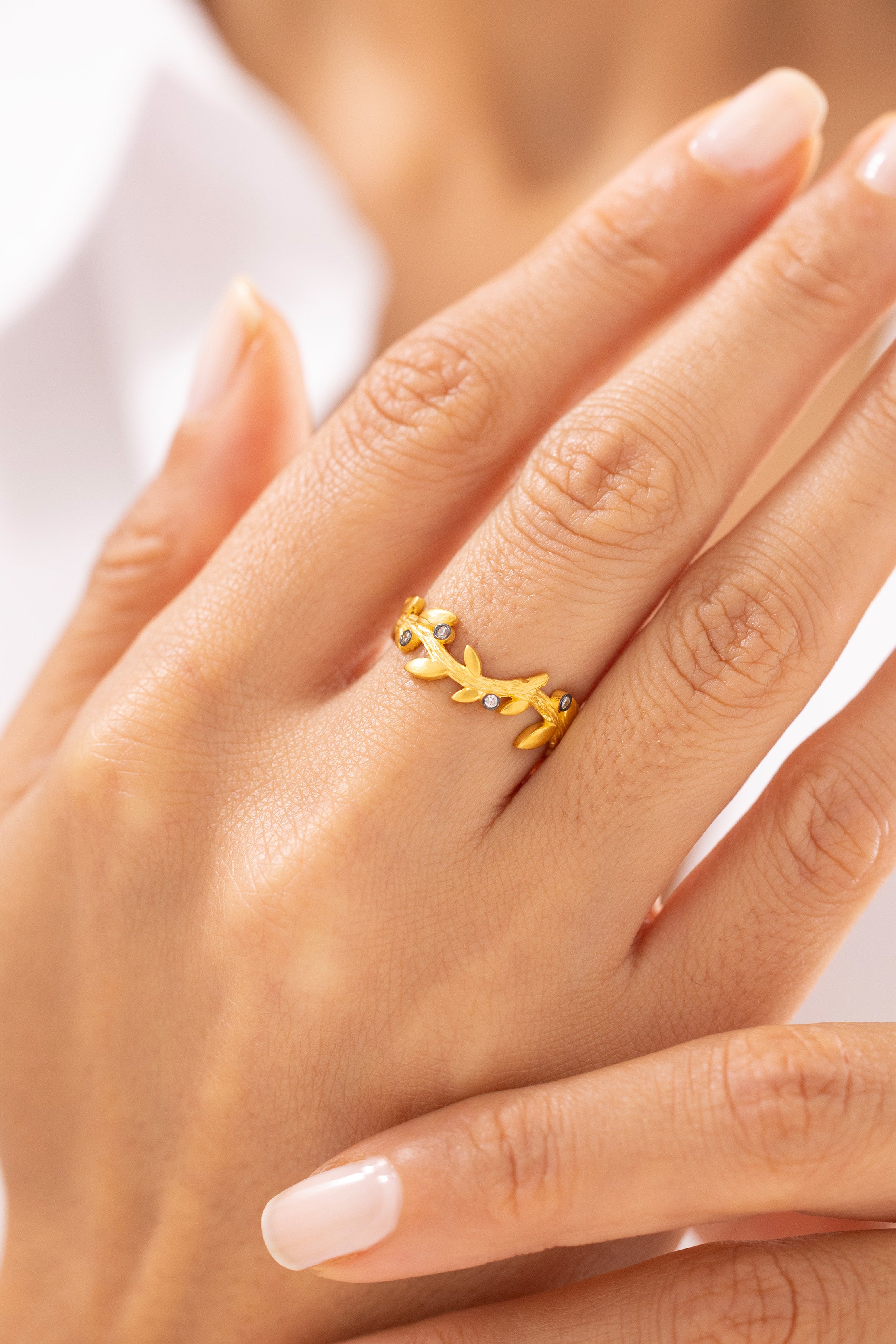 Yaprak formundaki el işçiliği detaylar, yaşamın sürekli yenilenen döngüsünü temsil ederken; küçük taş dokunuşları parıltısını zamansız bir şıklıkla tamamlar.