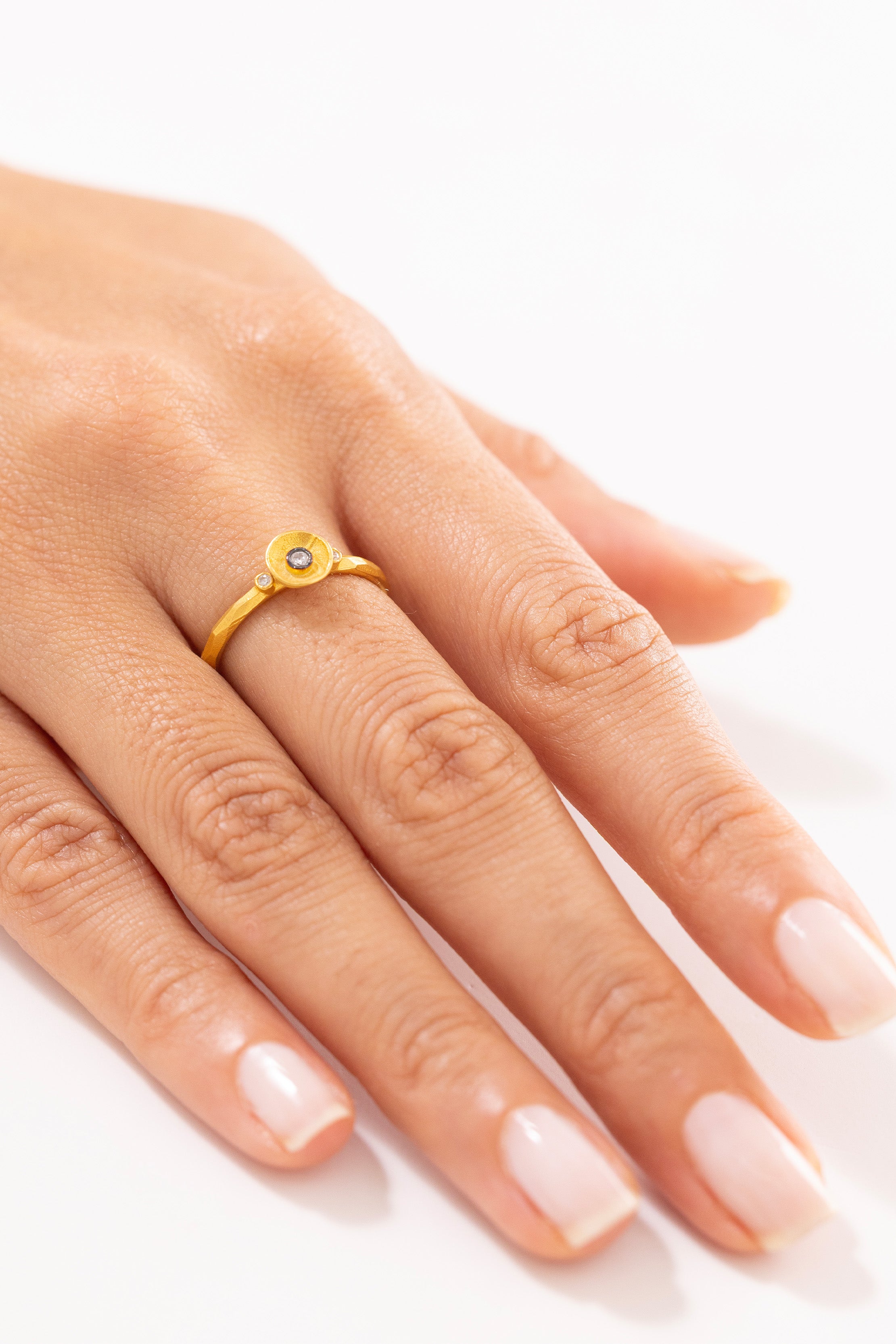 Yuvarlak taş detayı, ışığın altınla dansını yakalarken, sade formu her stile uyum sağlar.