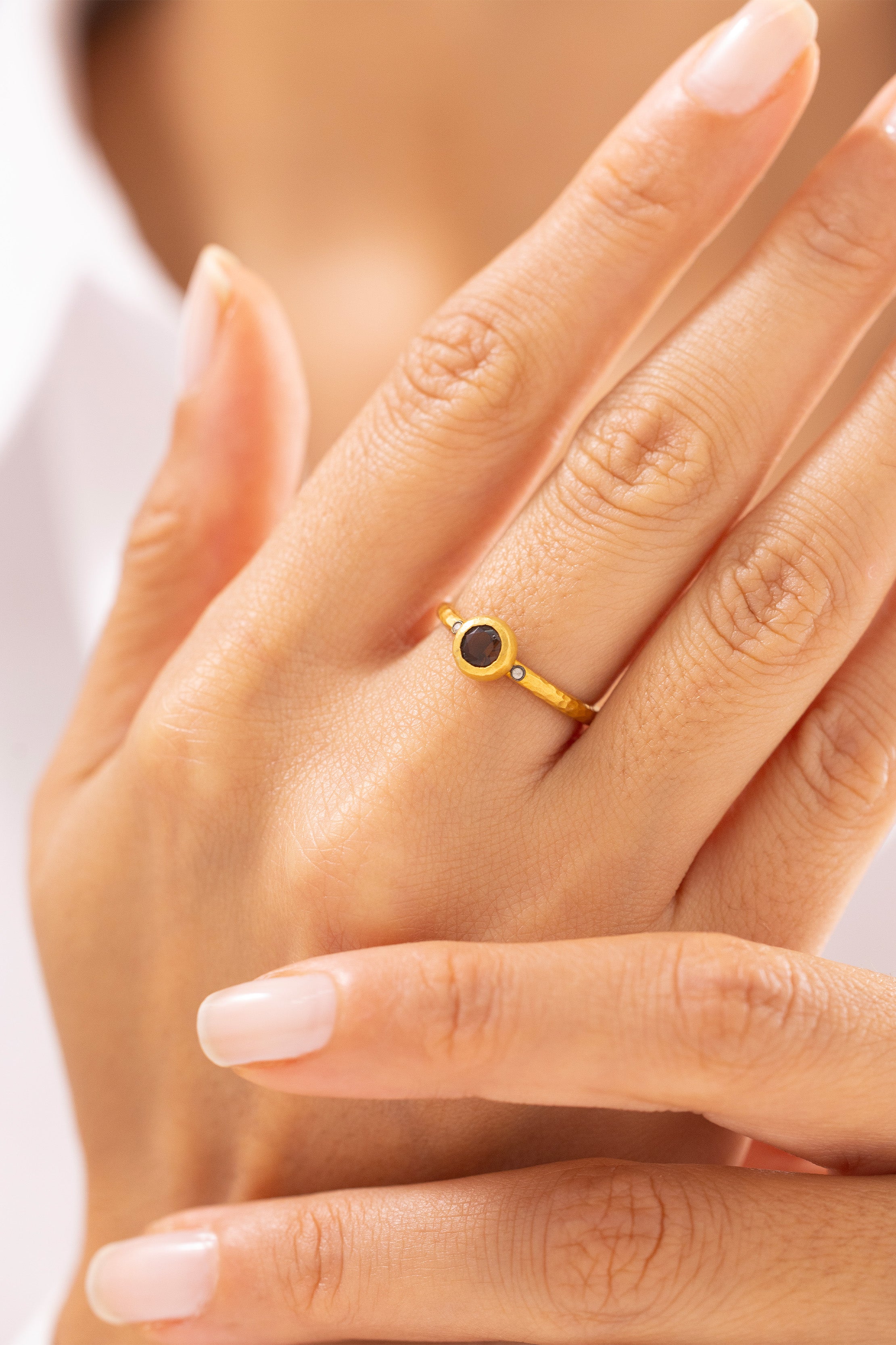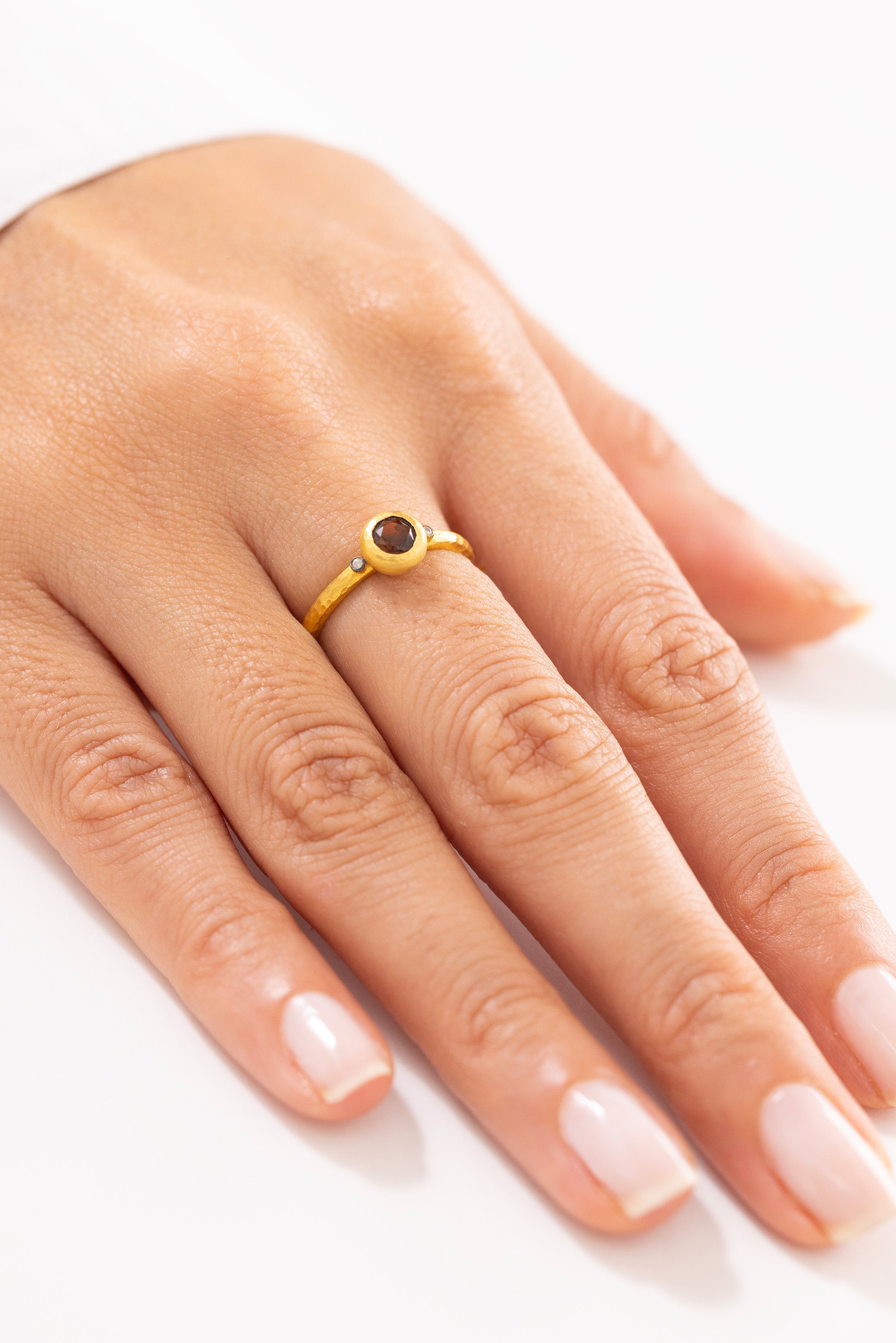 Koyu kırmızı taşın derin ışıltısı, altının sıcak dokusuyla birleşiyor.