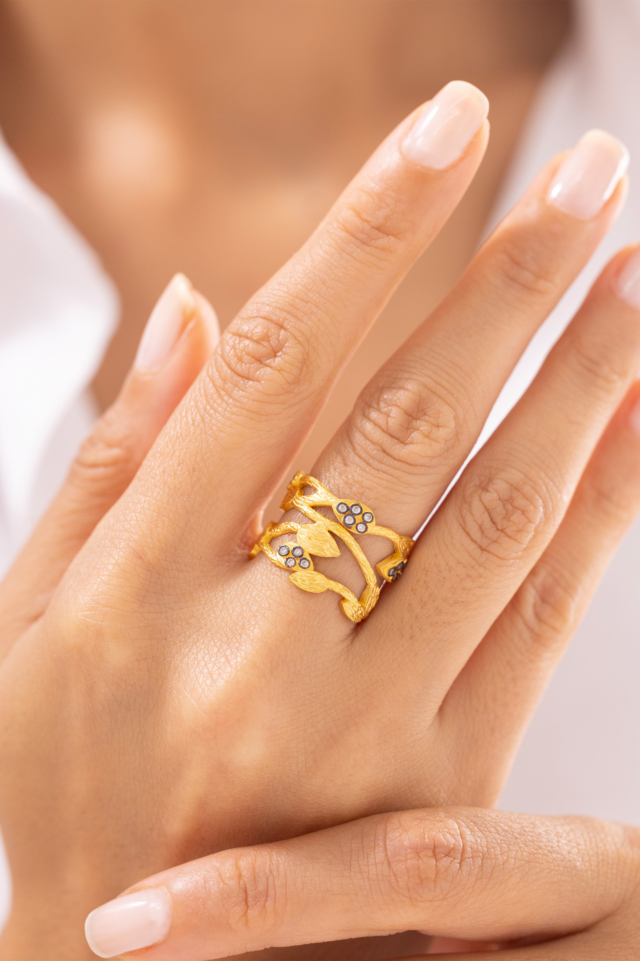 El işçiliğiyle şekillendirilen yaprak formları, yaşamın doğal akışını temsil ederken; taş detayları altının sıcak ışıltısına zarif bir kontrast katıyor.