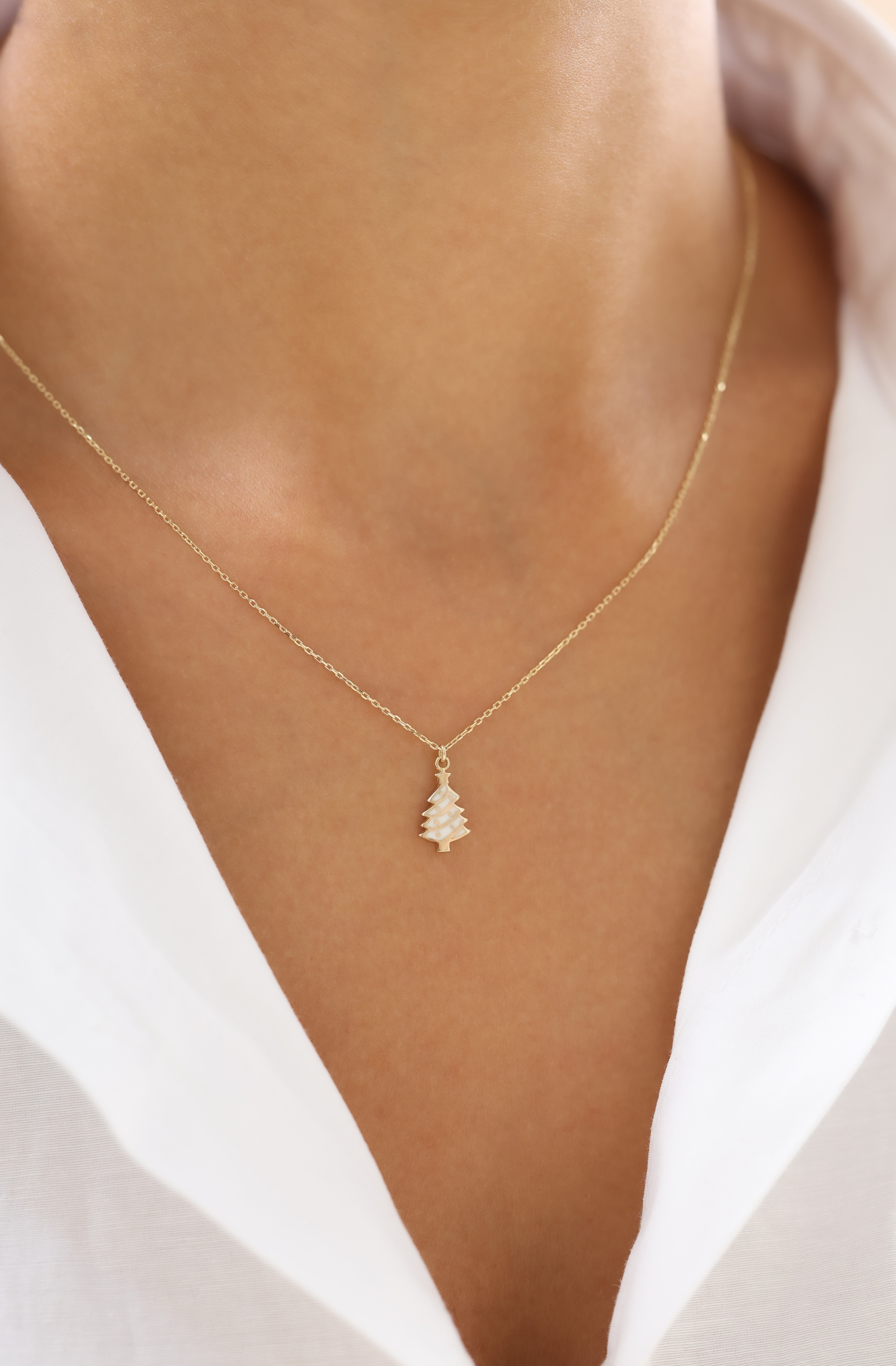 Beyaz Mineli Çam Ağacı 14 Ayar Altın Kolye