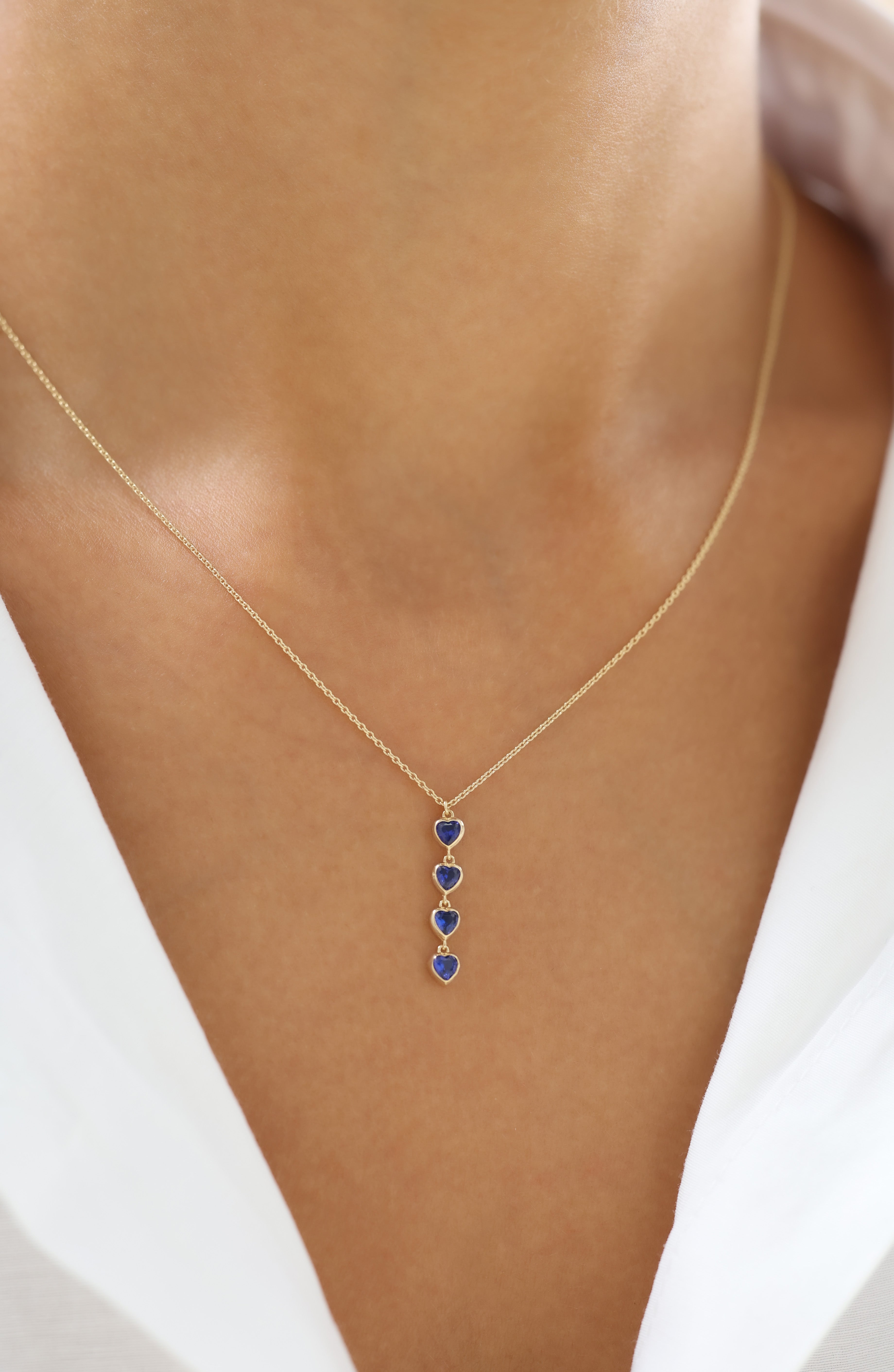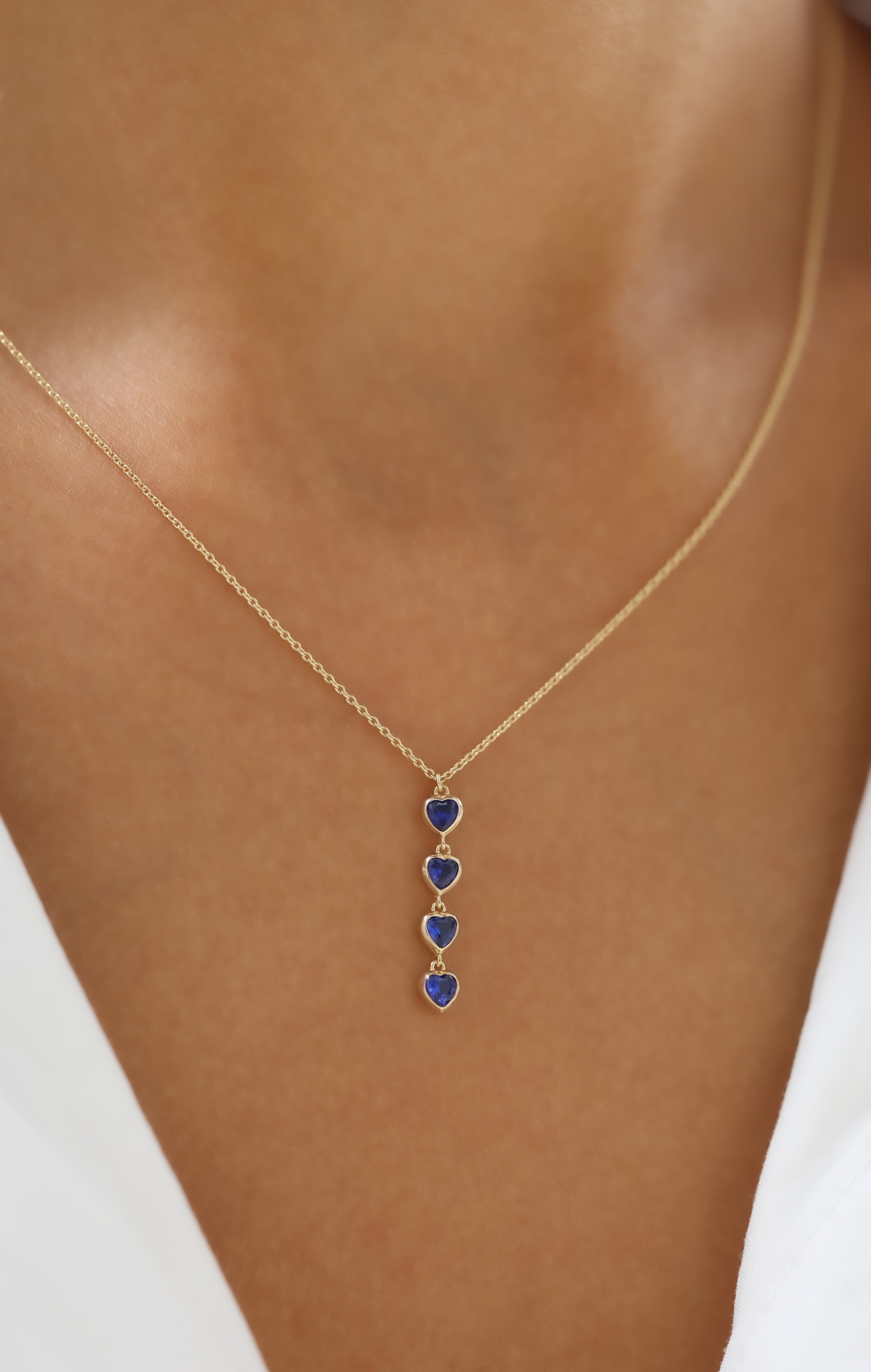 Dörtlü Mavi Taşlı Kalp 14 Ayar Altın Kolye