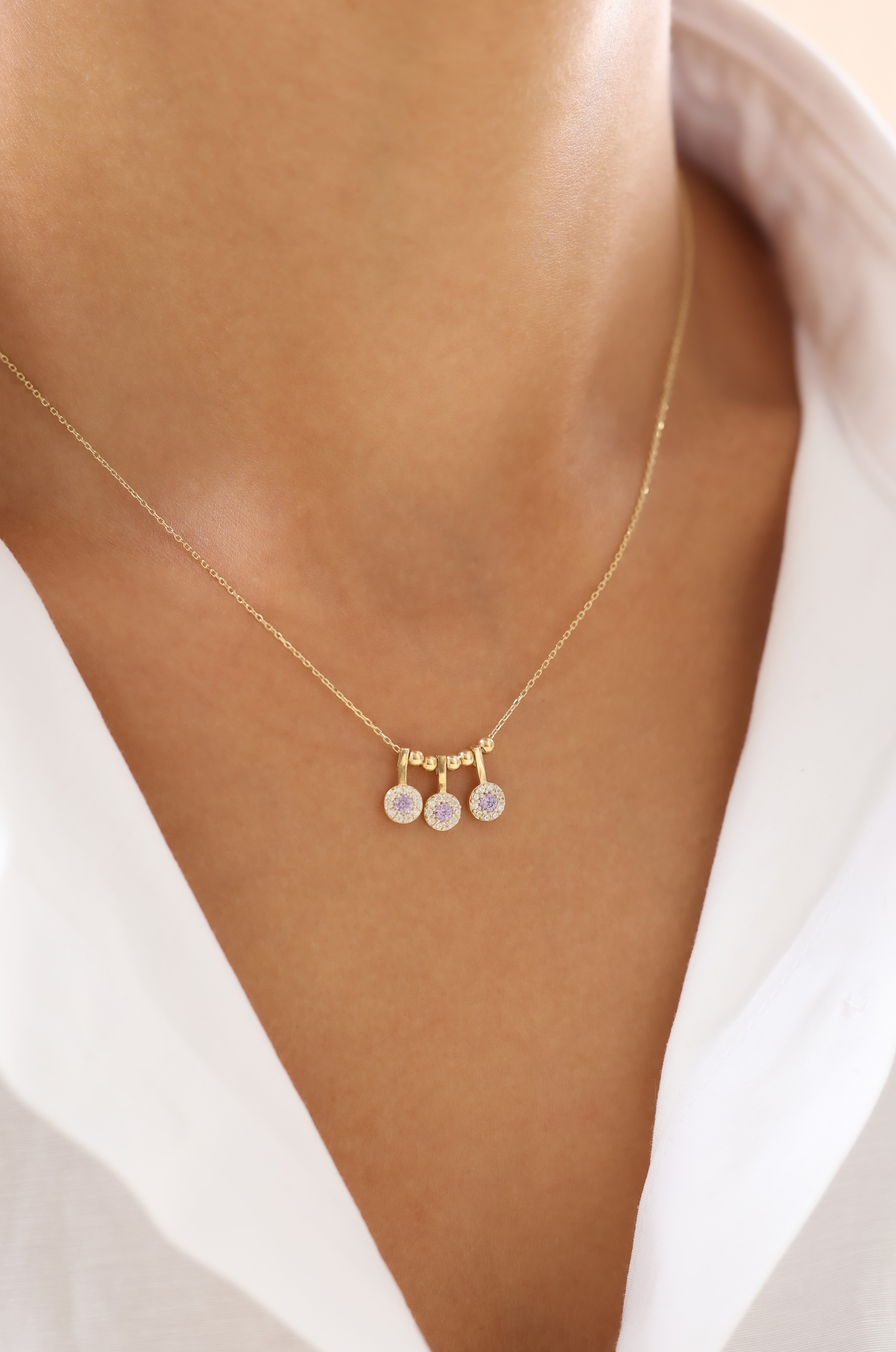 Göz Alıcı Mor Taşlı ve İşlemeli 14 Ayar Altın Kolye, modern dokunuşlarla yeniden yorumlanmış klasik bir şıklığı temsil ediyor.Üç adet mor taş detay, zarif altın halkalarla bir araya gelerek ışığı en etkileyici şekilde yansıtıyor. Mor taşın asaletiyle altının sıcak tonları buluşarak, hem gündüz hem gece stillerinde benzersiz bir uyum yaratıyor.