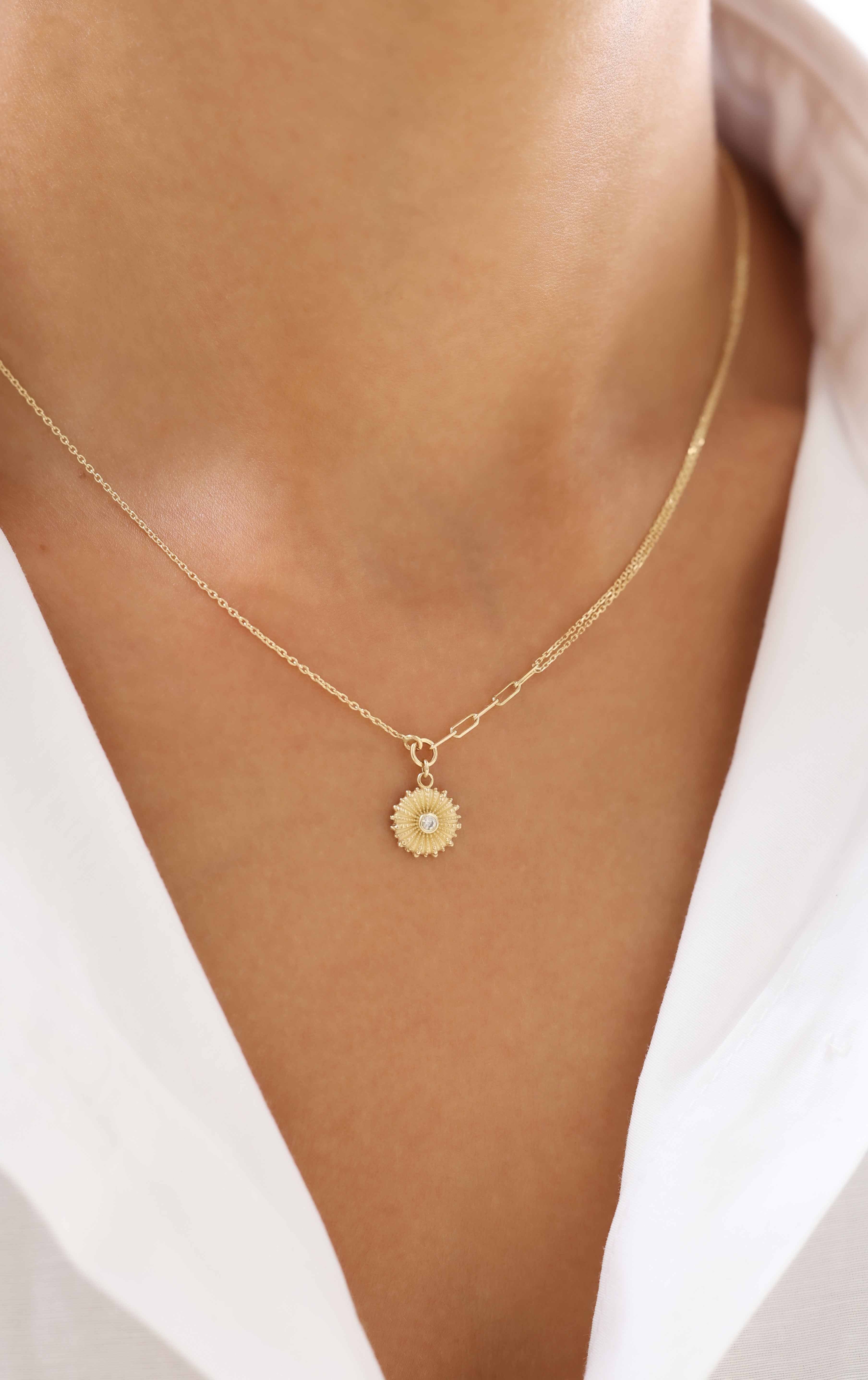 Zarif altın formun merkezindeki taş detayı, boyunda adeta parlayan bir güneş etkisi yaratıyor.