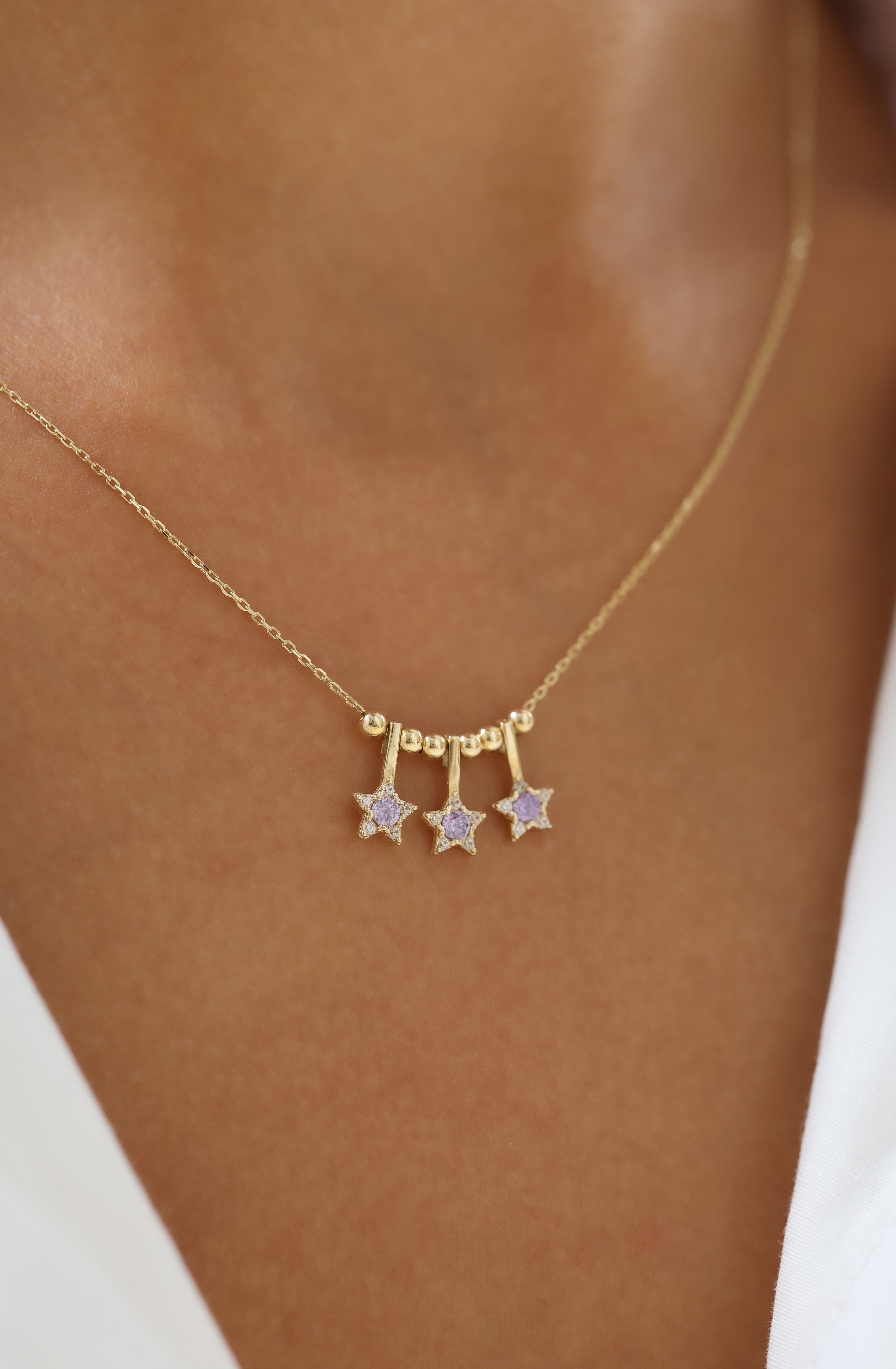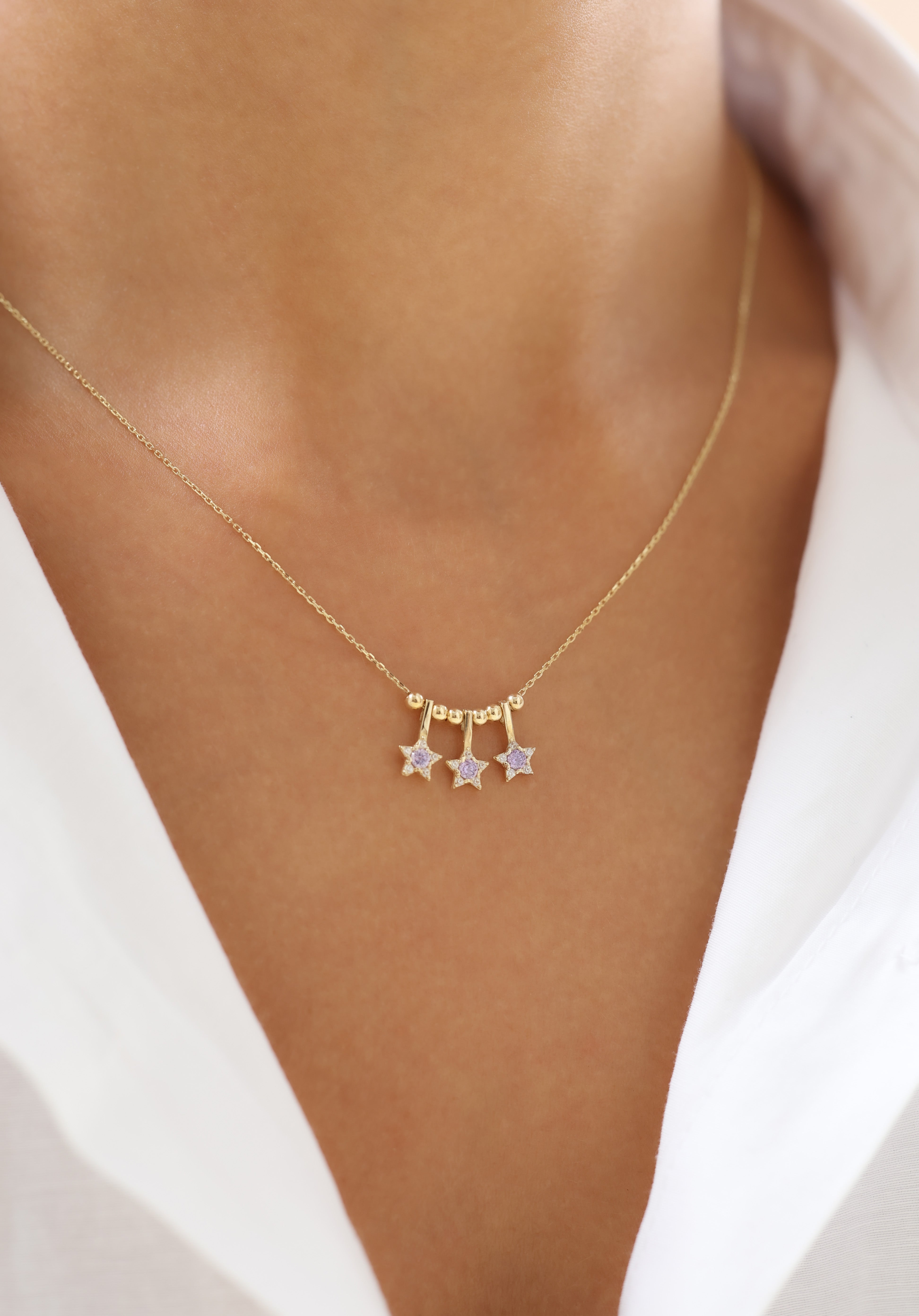 Işıltılı Lila Yıldızlı 14 Ayar Altın Kolye, modern çizgilerle romantik bir dokunuşu bir araya getiriyor. Üç yıldız formundaki detaylar, lila taşların yumuşak parıltısıyla boynunuzda zarif bir gökyüzü etkisi yaratır.