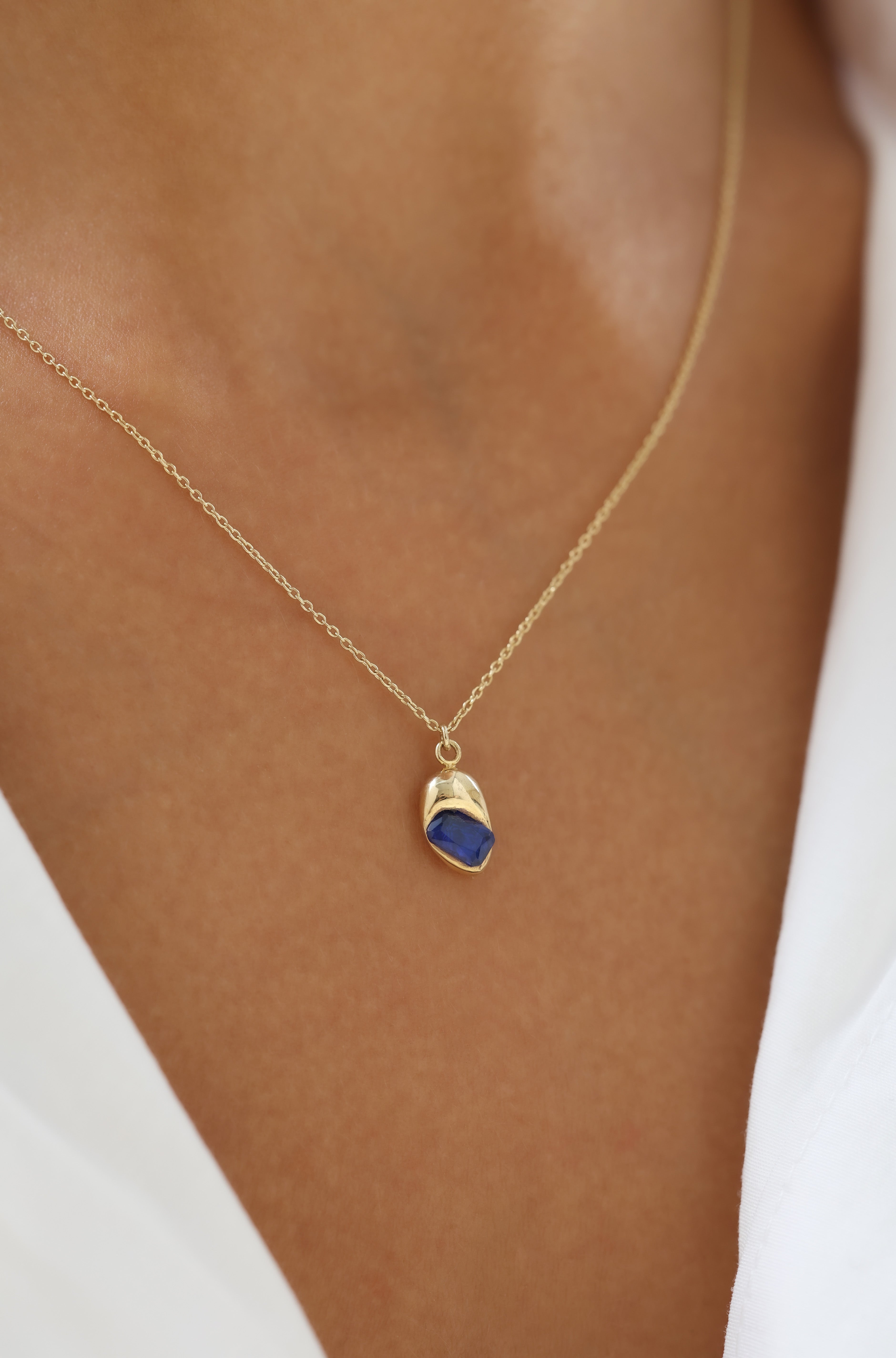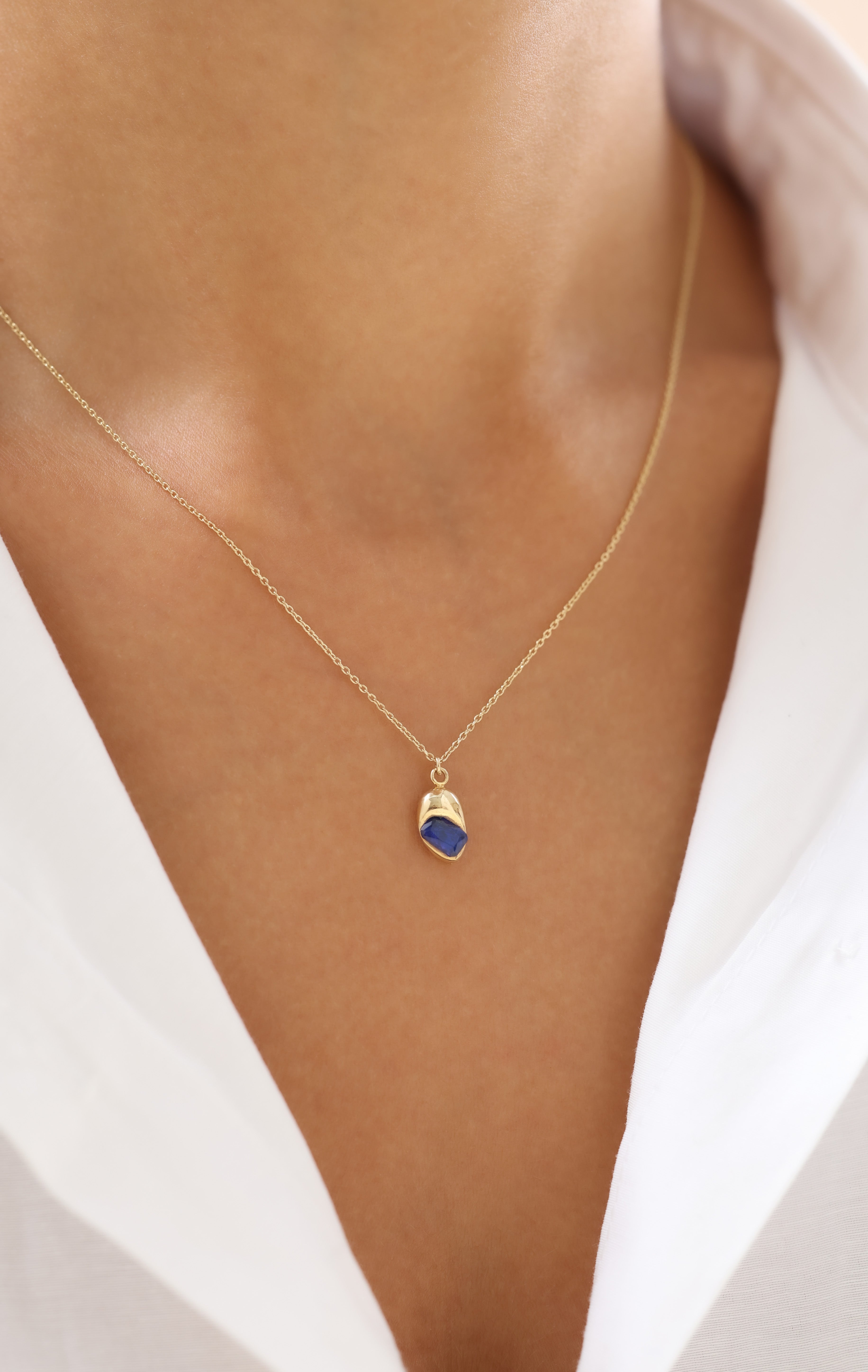 Lacivert Taşlı Organik Form 14 Ayar Altın Kolye, doğadan gelen akışkan çizgileri modern bir estetikle buluşturur. Organik formu sayesinde her biri benzersiz bir karakter taşırken, lacivert taşın huzur verici enerjisi zarafetiyle göz kamaştırır.