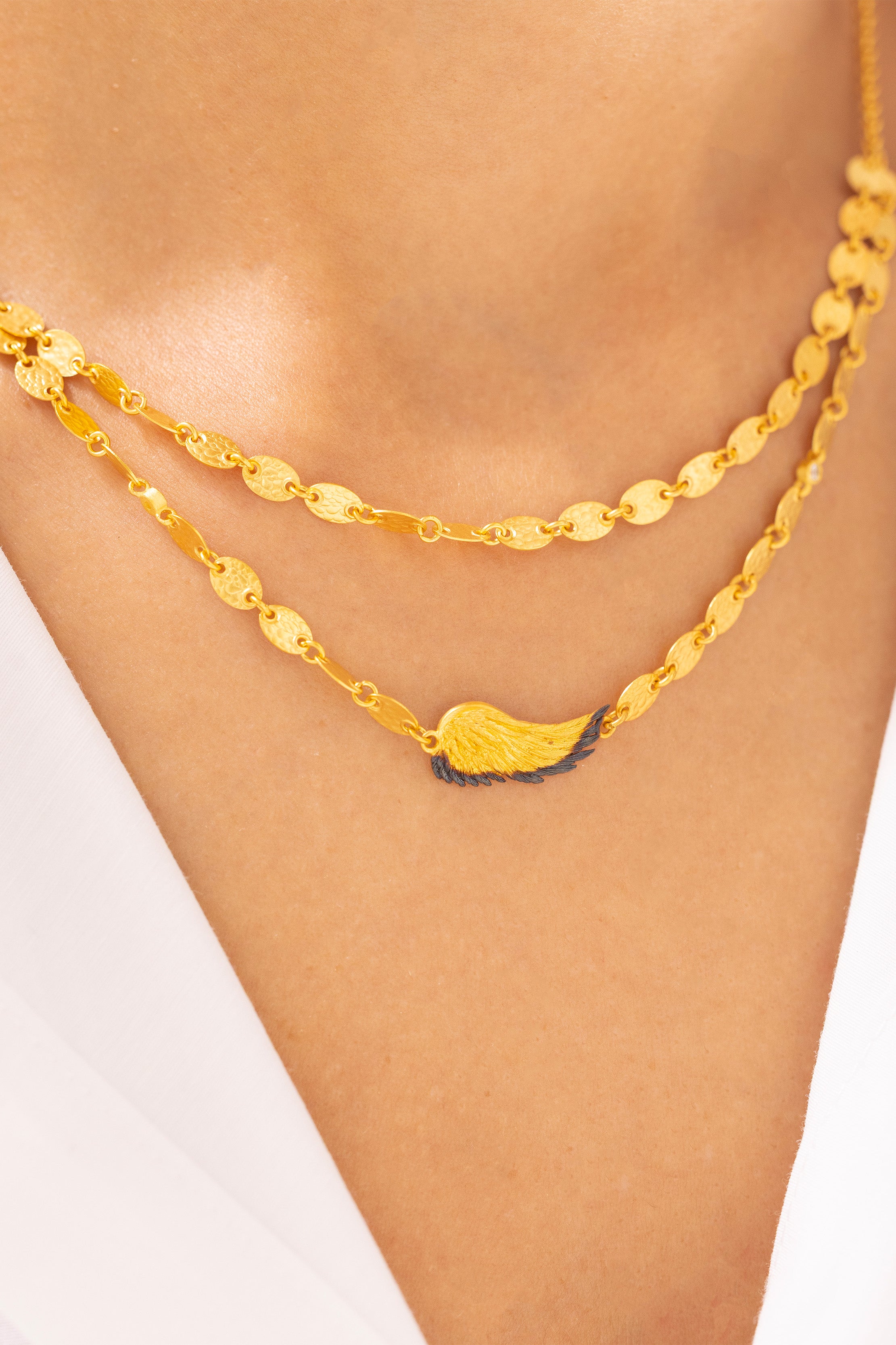 Her adımında zarafet, her dokunuşta anlam… Bu özel tasarım, iki katlı zincir yapısıyla modern bir zarafet sunarken, merkezde yer alan melek kanadı figürüyle koruyucu bir sembol taşır. El işçiliğiyle işlenen altın yüzey, siyah detaylarla birleşerek güçlü bir kontrast oluşturur, tıpkı ışığın karanlıkta parlayışı gibi.
