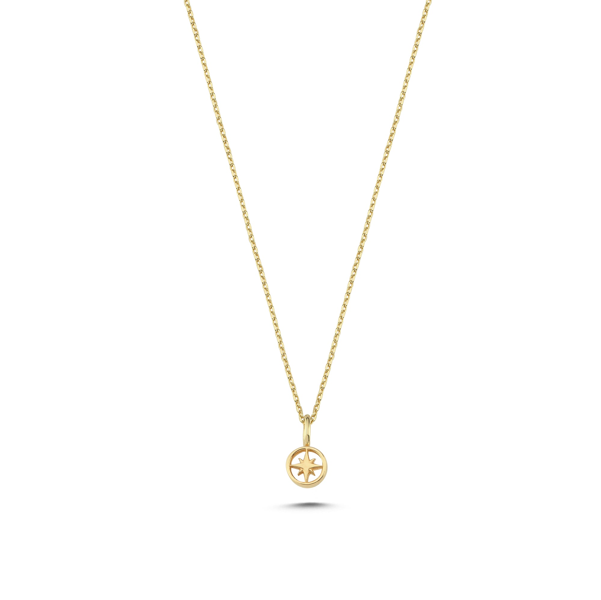 14 ayar altının değerli dokusu üzerine işlenen yıldız formu ve pusula motifi ile bu kolye sadece bir aksesuar değil