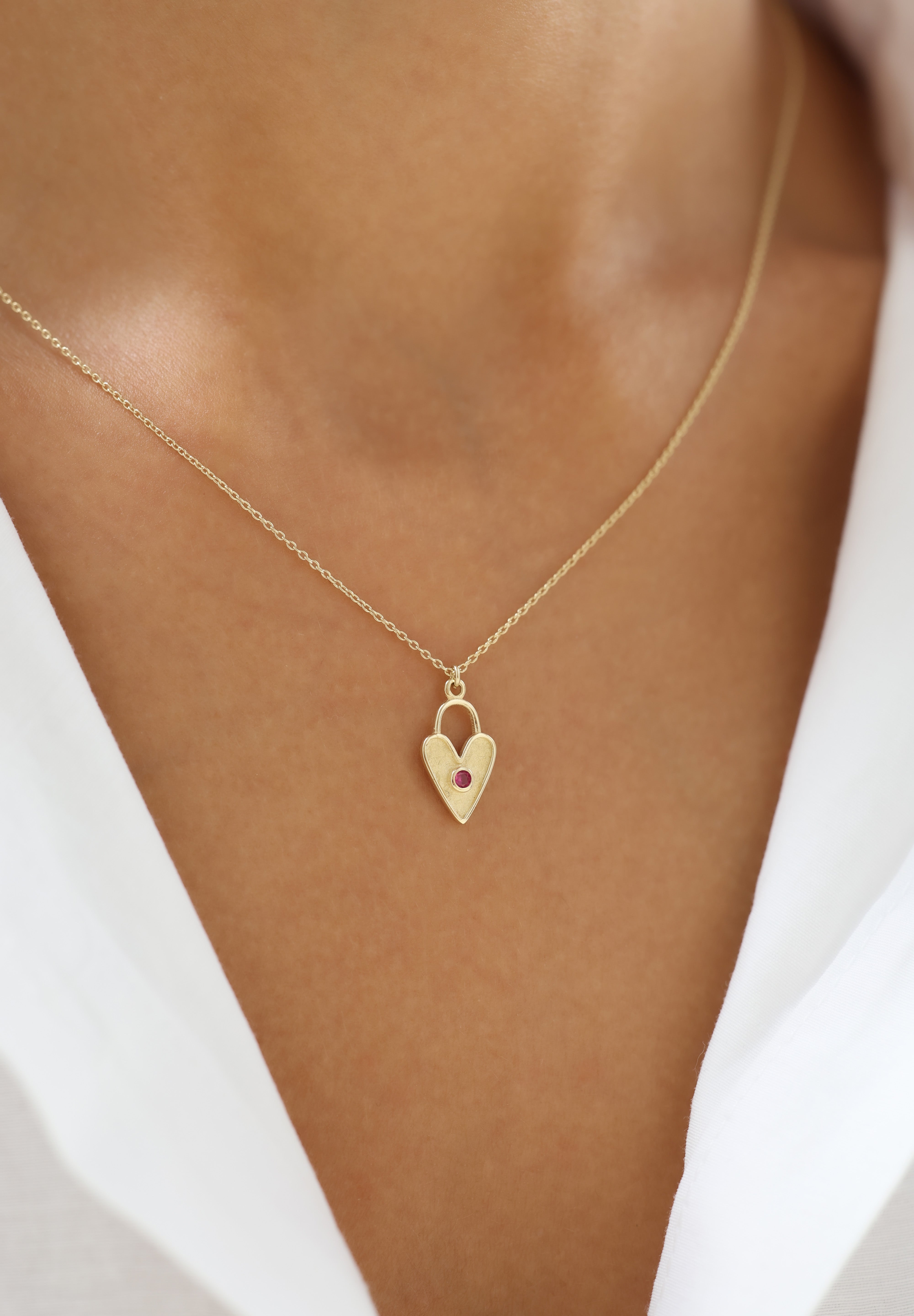 Kalp formundaki kilit, içinde saklı duyguların değerini temsil ederken, ortasındaki pembe taş romantizme canlı bir dokunuş katıyor.