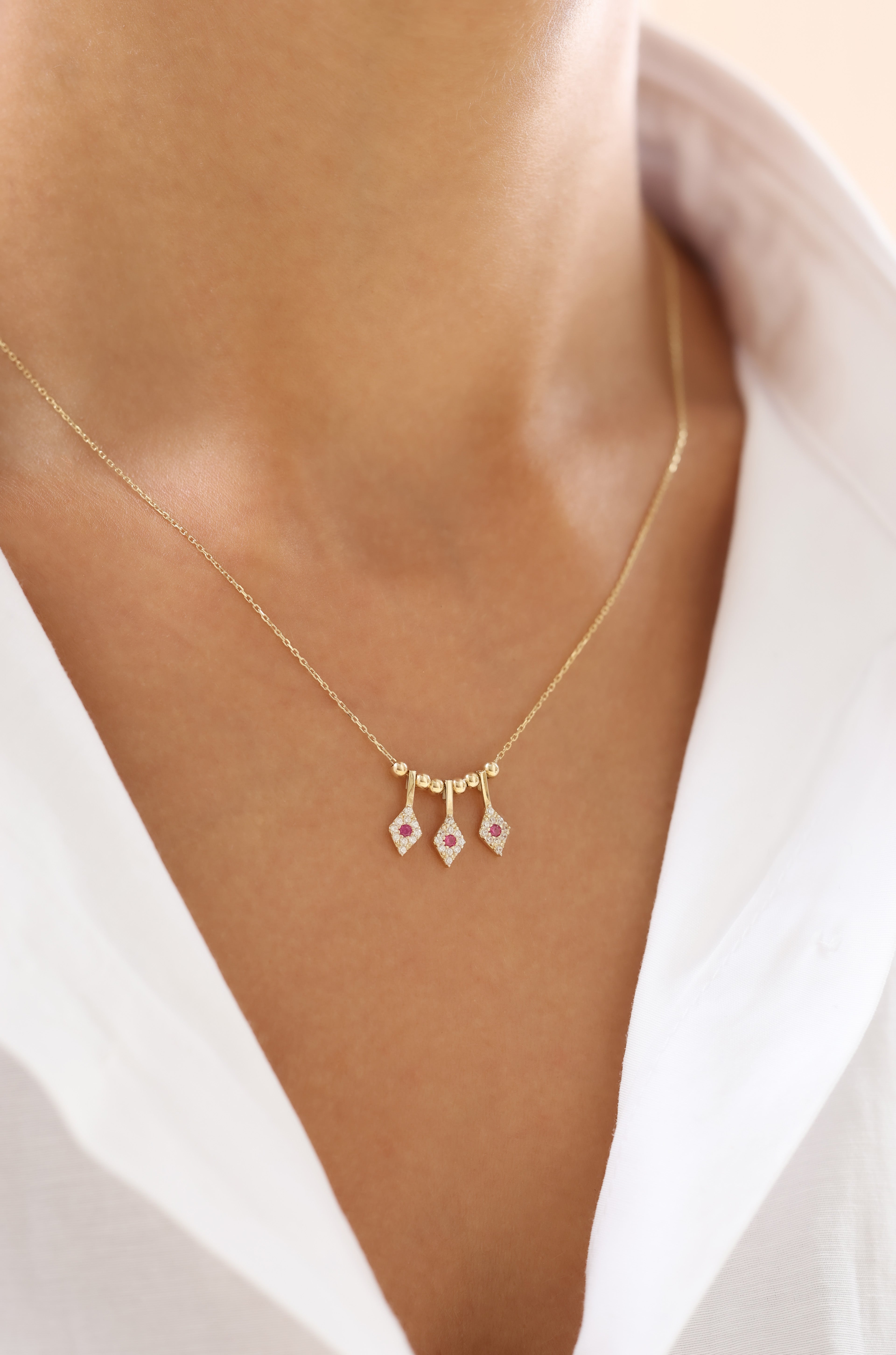 Pembe Taşlı Üçlü Tasarım 14 Ayar Altın Kolye, sade çizgilerle modern bir zarafet sunar. Üçlü formu, dengeli bir ışıltı yaratırken ortasındaki pembe taşlar, romantik bir dokunuş ve canlı bir renk vurgusu katar.