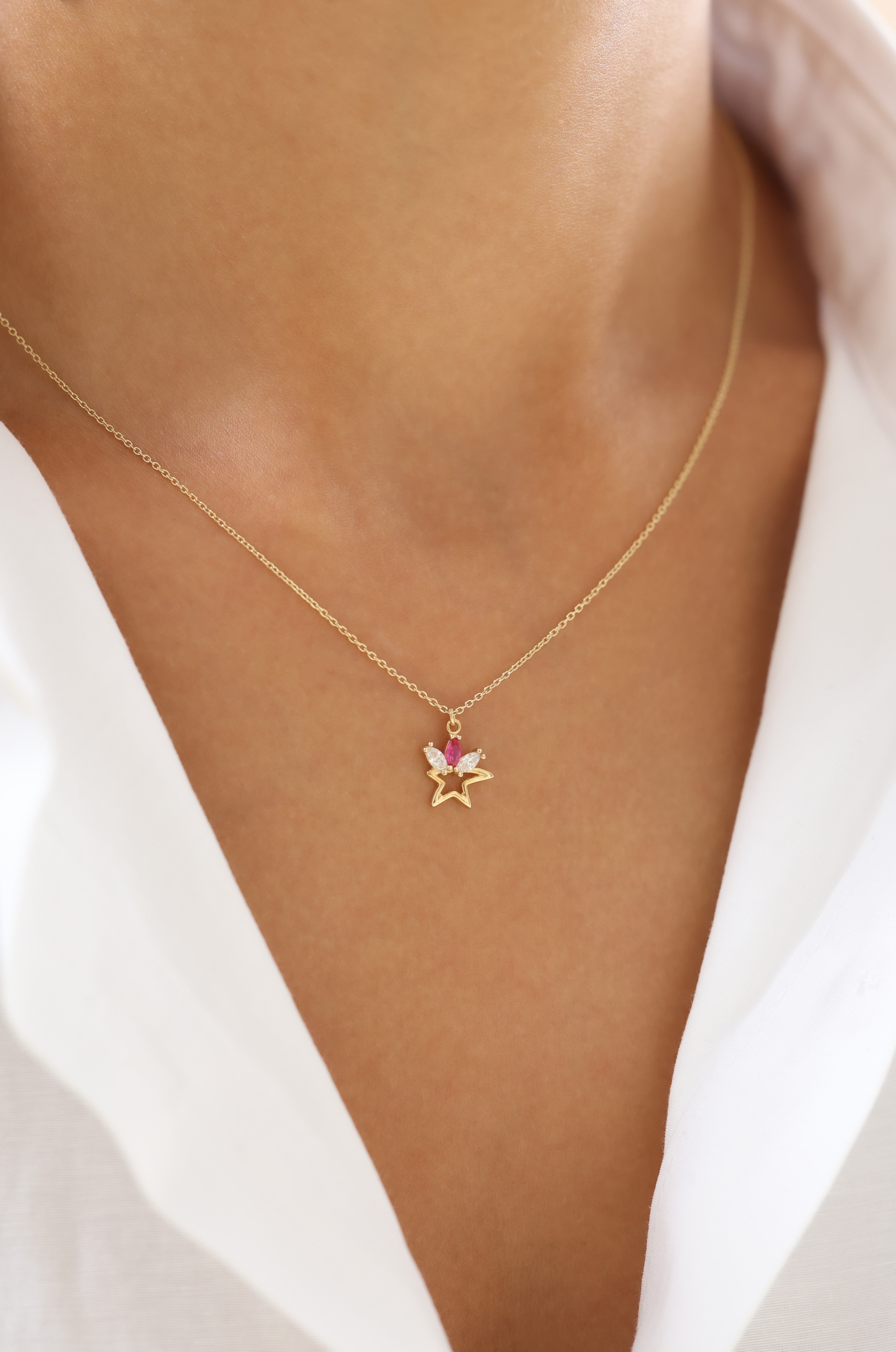 Pembe ve Beyaz Taşlı Yıldız 14 Ayar Altın Kolye, feminen ve modern detayları bir araya getirerek ışıltısını her ortamda hissettiriyor.