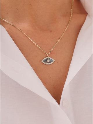 Göz alıcı bir sembol, koruyucu bir anlam… Bu 14 ayar altın kolye; mavi minesi, merkezindeki inci detayı ve çevresini saran parlak taşlarla modern bir nazar temasını lüks bir yorumla sunar.