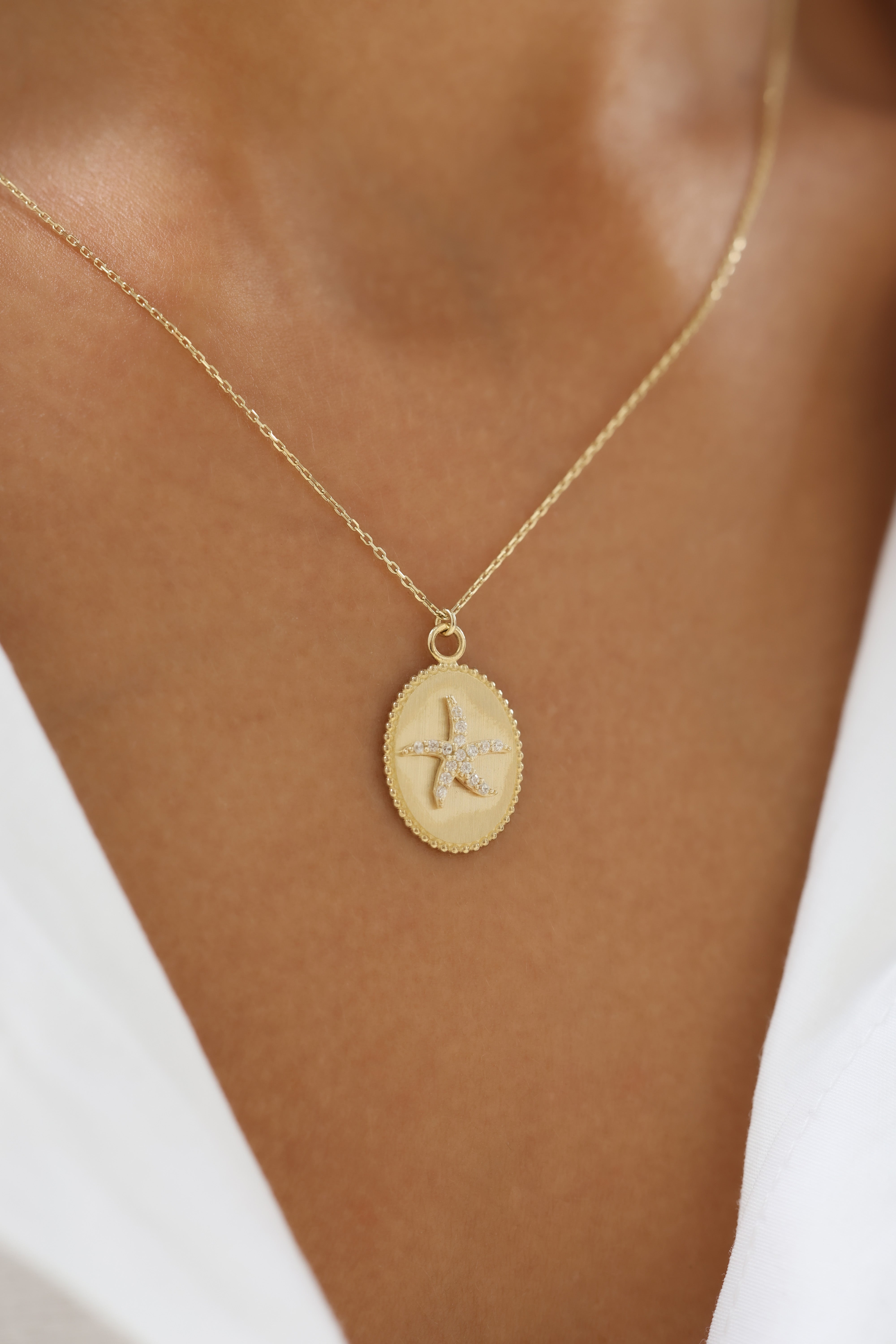 El işçiliğiyle şekillendirilmiş madalyon formu, merkezinde yer alan pırlanta ışıltılı deniz yıldızı motifi ile dikkat çekiyor. 14 ayar altının sıcak tonları, deniz yıldızının parıltısını öne çıkararak yazın enerjisini yıl boyu taşımanı sağlar.