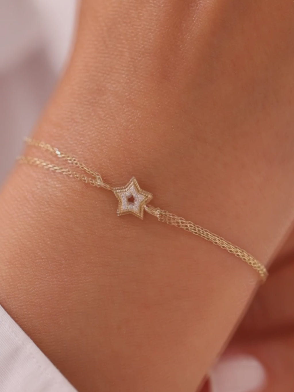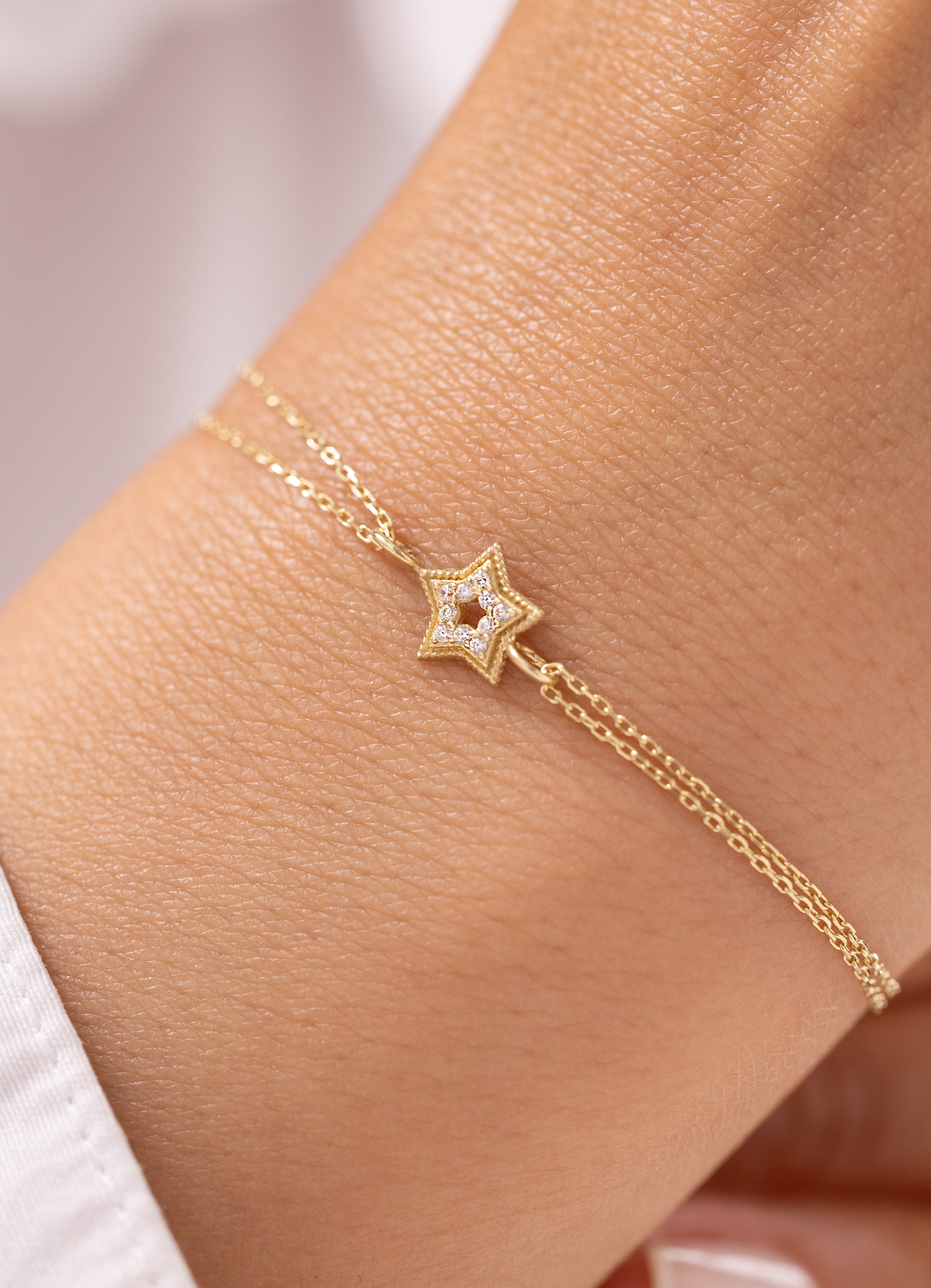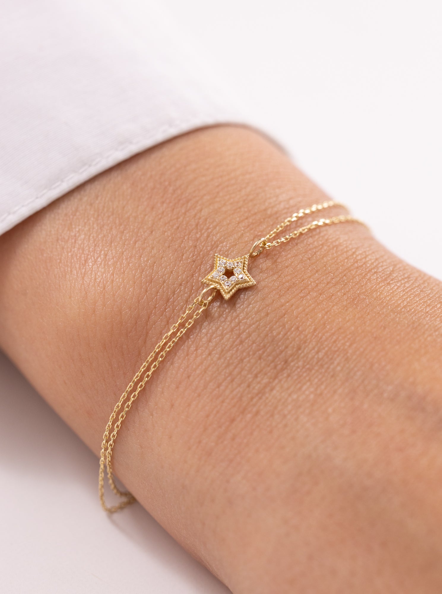 Taşlı Yıldız Çift Zincirli 14 Ayar Altın Bileklik
