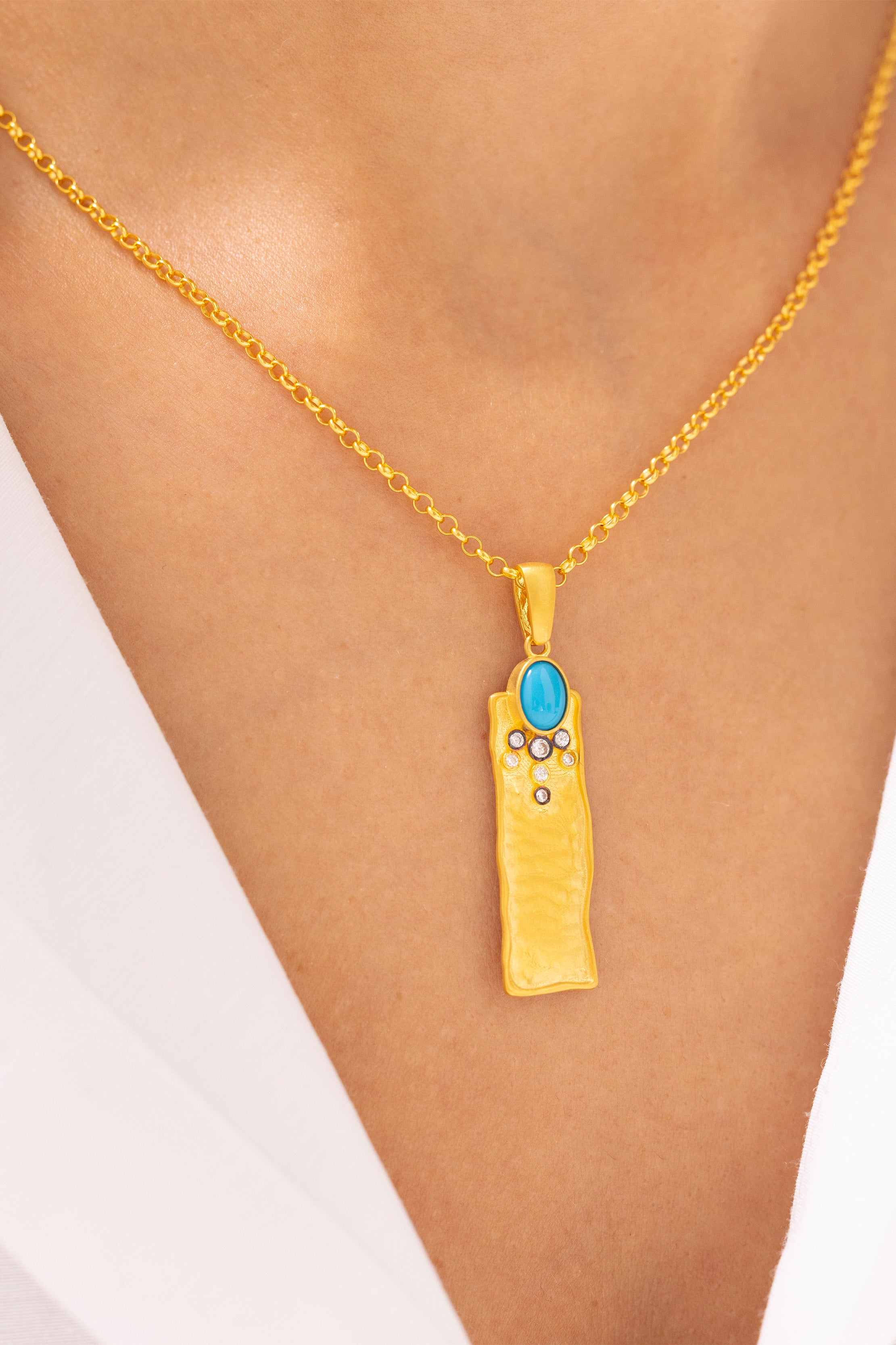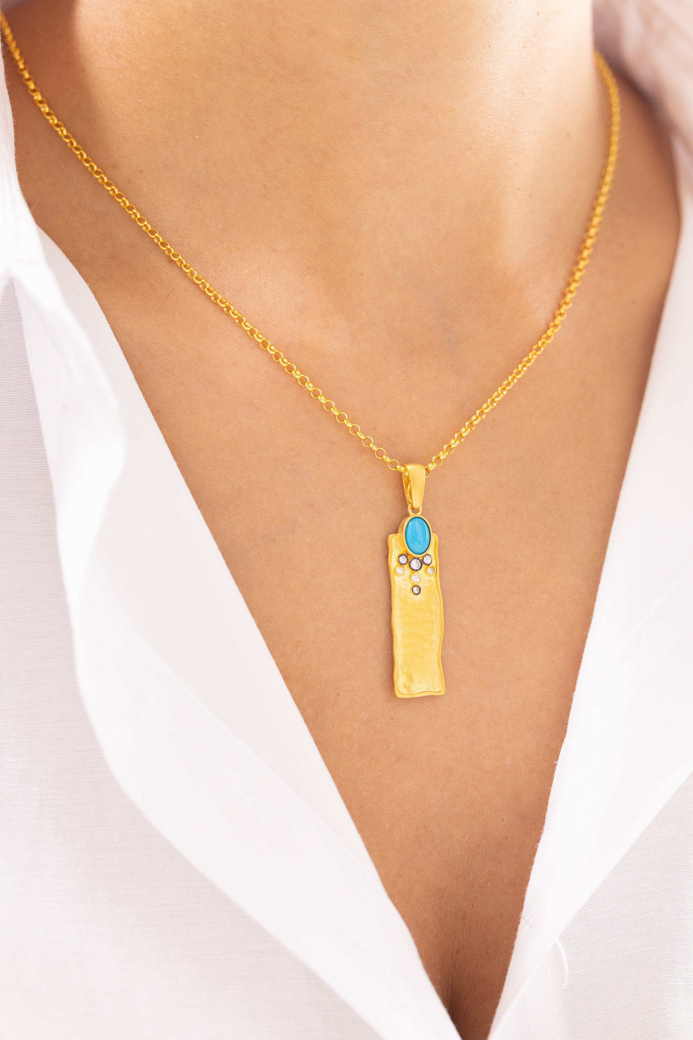Turkuaz Taşlı Antik Dikdörtgen 14 Ayar Altın Kolye, zamansız güzelliği modern bir duruşla buluşturur. Antik dönemlerin dokusunu yansıtan dikdörtgen formu, el işçiliğiyle işlenmiş yüzeyi ve dikkat çekici turkuaz taşıyla göz kamaştırır.