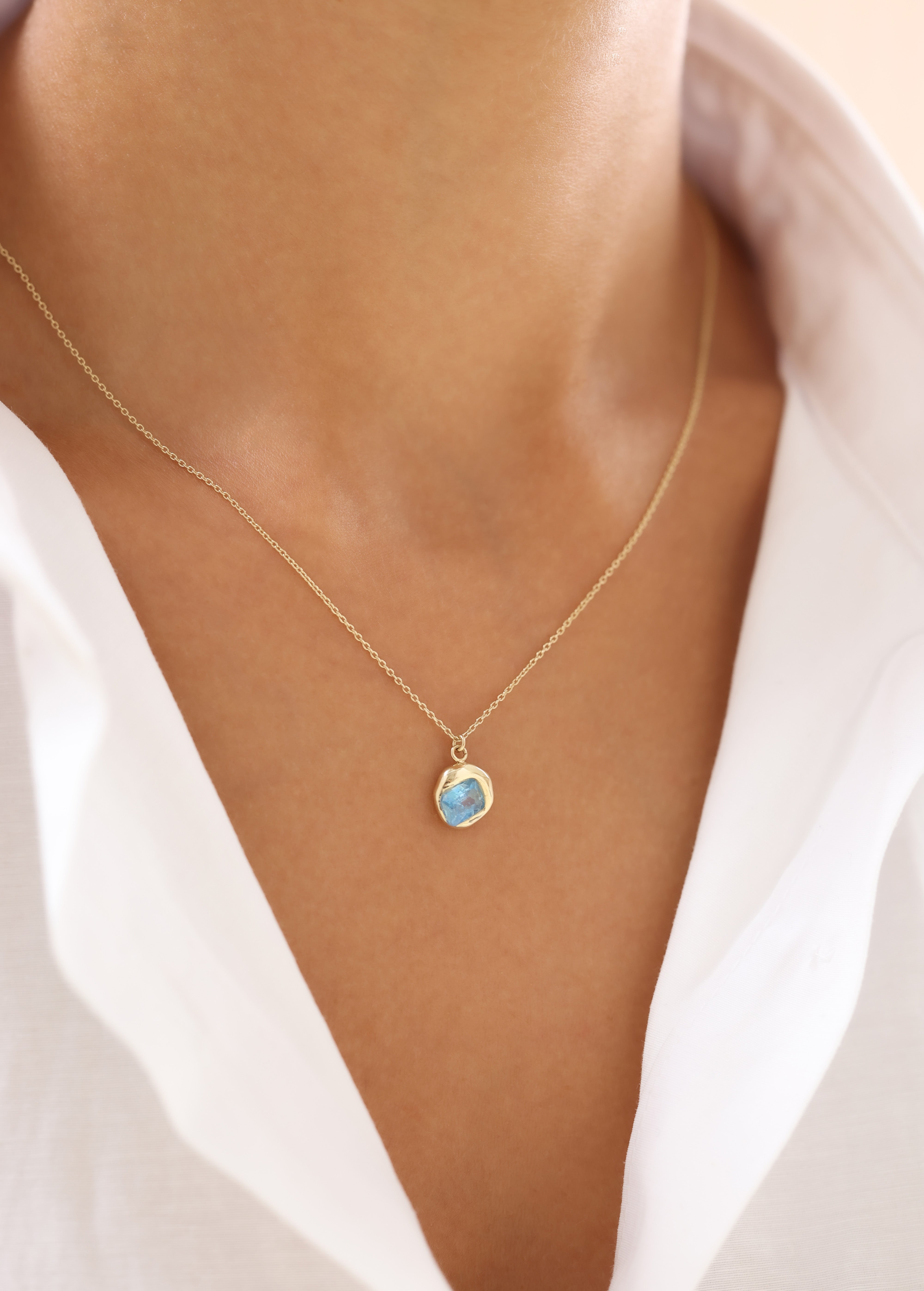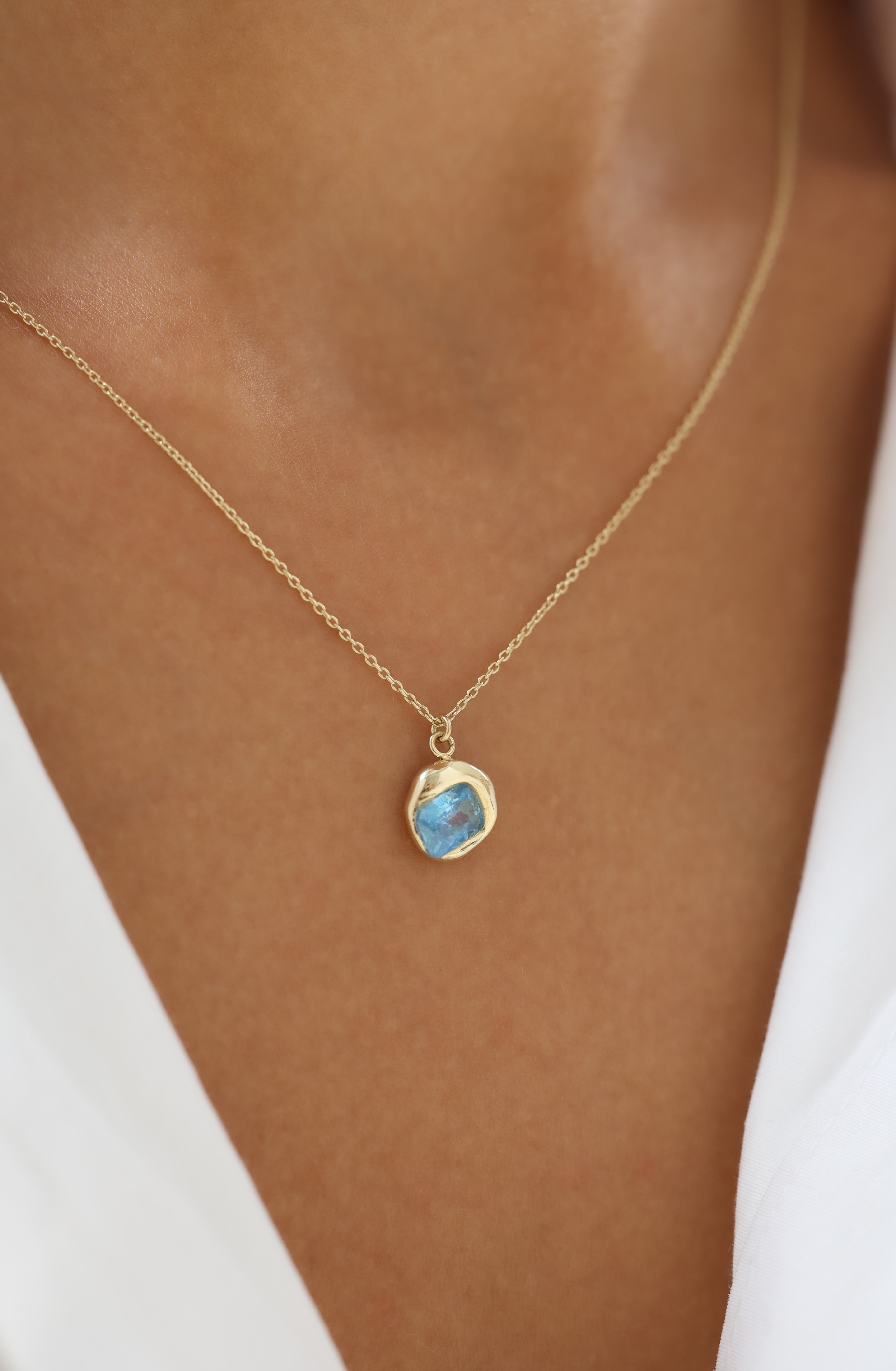 Eşsiz formdaki mavi taş, denizin huzurunu ve gökyüzünün sonsuzluğunu yansıtırken; el işçiliğiyle şekillendirilmiş altın yüzey, her açıdan farklı bir ışıltı sunar. Vintage esintili detaylar, kolyeye karakter katar ve onu sade ama güçlü bir stile dönüştürür.
