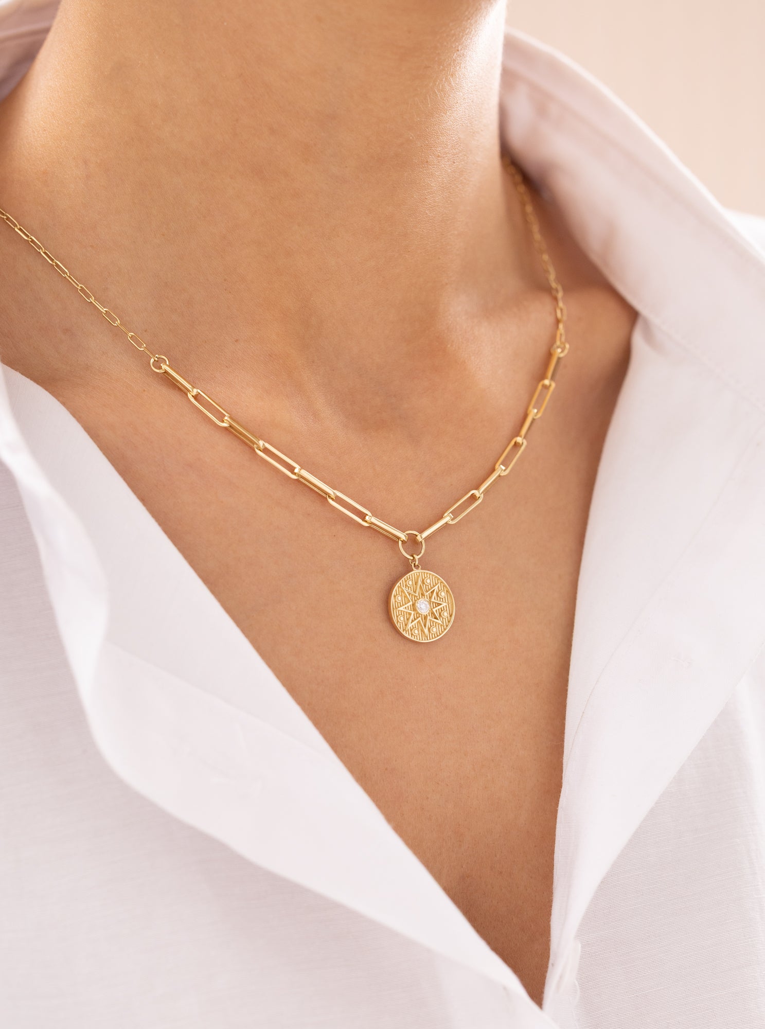 Vintage Gökyüzü Madalyon 14 Ayar Altın Kolye, gökyüzünün ebedi huzurunu ve içsel korumayı bir arada taşır.Vintage dokunuşlarla işlenmiş yüzeyi, yıldız motifleriyle bezeli bu tasarım,