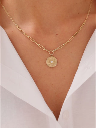 Vintage Gökyüzü Madalyon 14 Ayar Altın Kolye, gökyüzünün ebedi huzurunu ve içsel korumayı bir arada taşır.