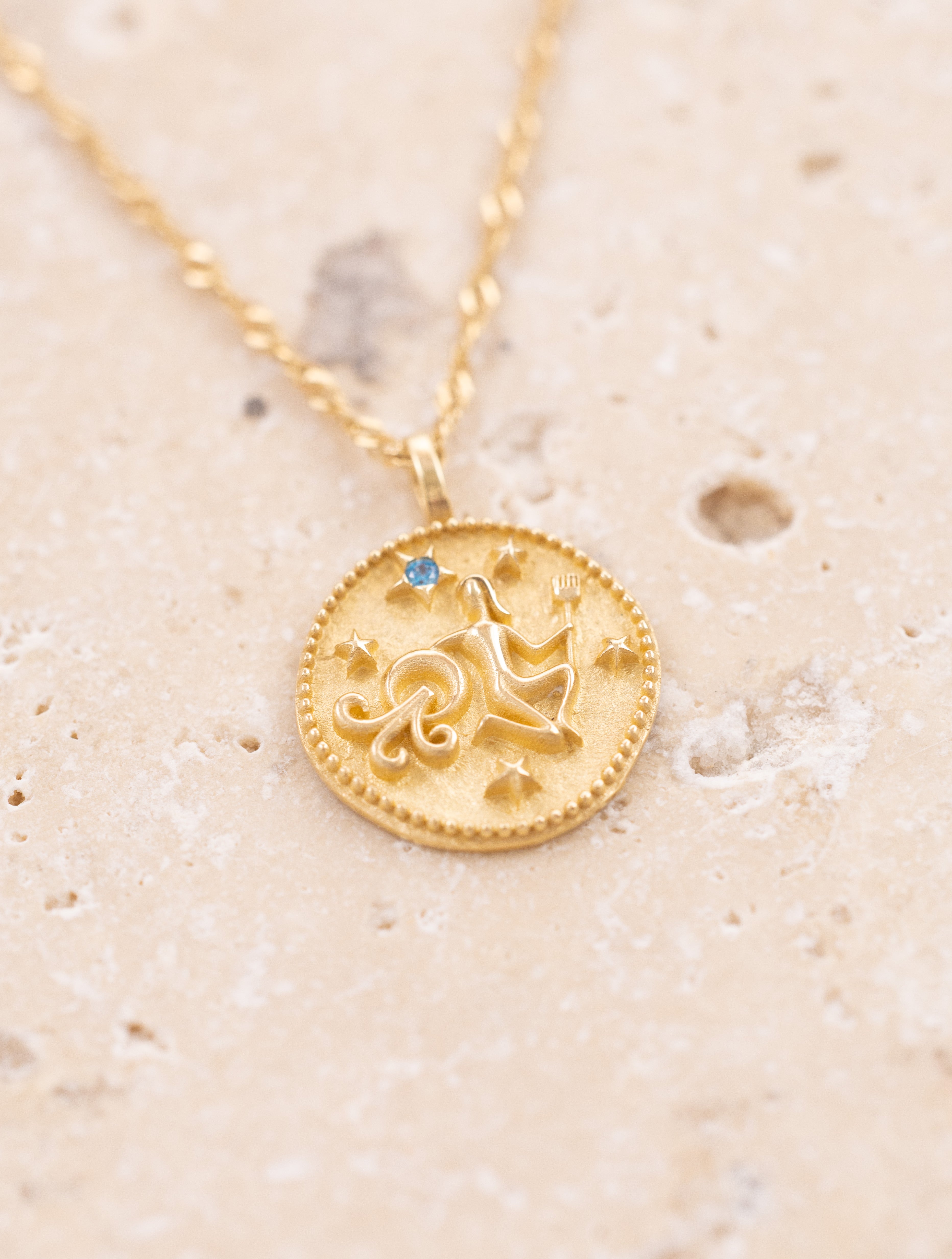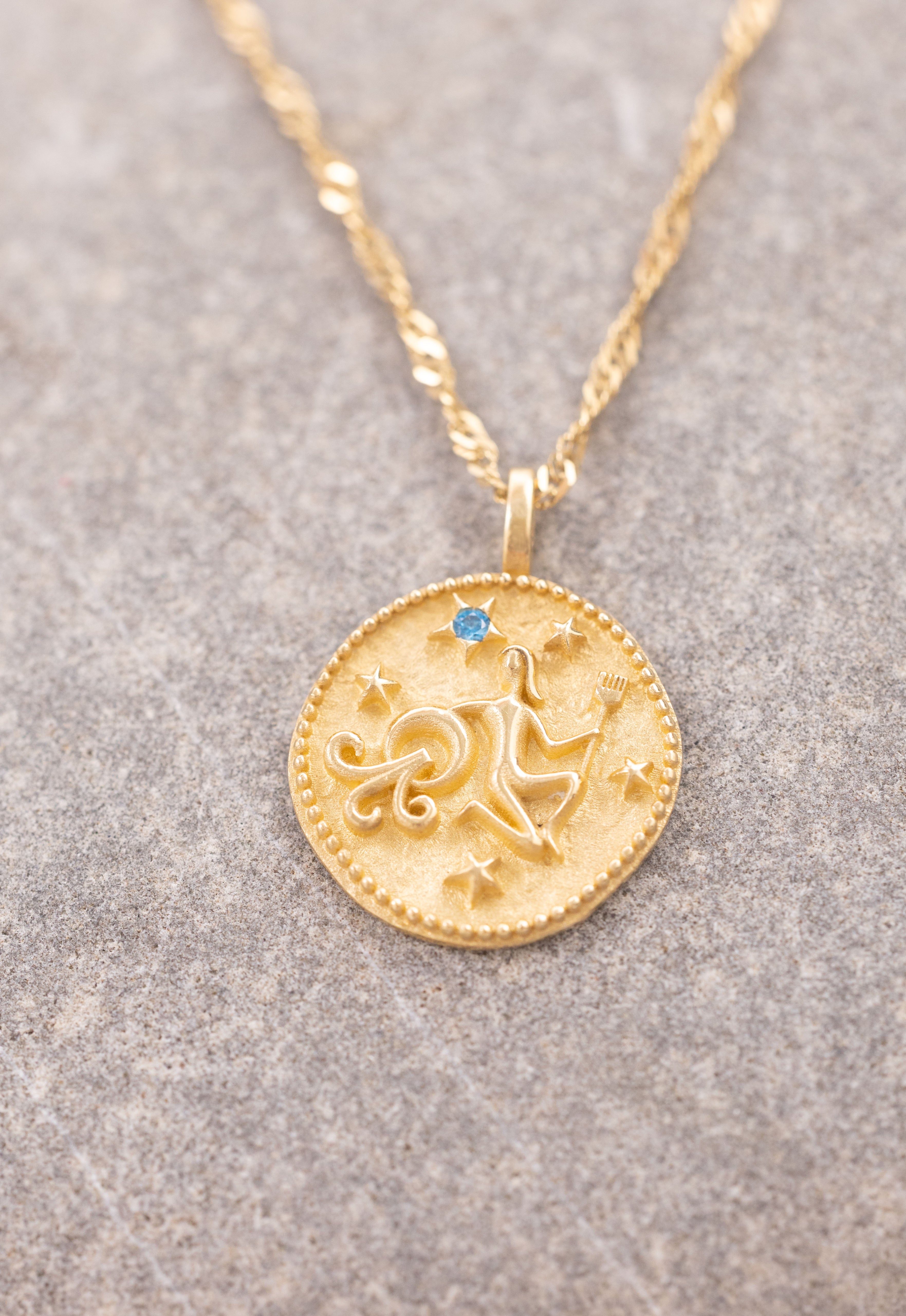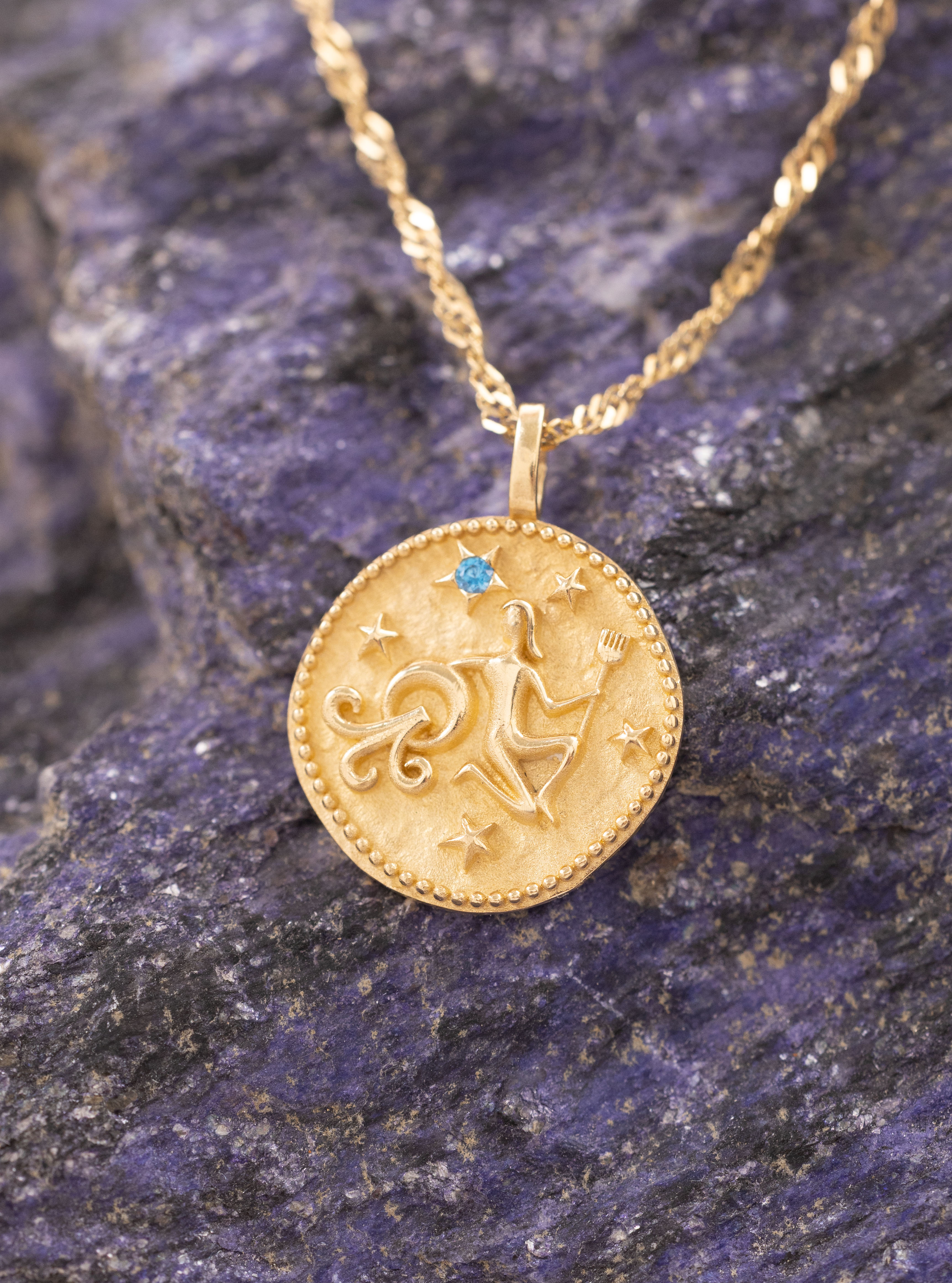 Kova burcunun yenilikçi ve özgür ruhunu taşıyan bu zarif kolye, antik madalyon formundaki yüzeyi ve nostaljik havasıyla dikkat çeker. Vintage dokunuşlarla bezenmiş bu tasarım, Kova’nın sıra dışı bakış açısını ve bireysel gücünü temsil eder. Her detayında anlam saklı bu özel kolye, burcunuzun enerjisini boynunuzda taşımak isteyenler için tasarlandı.