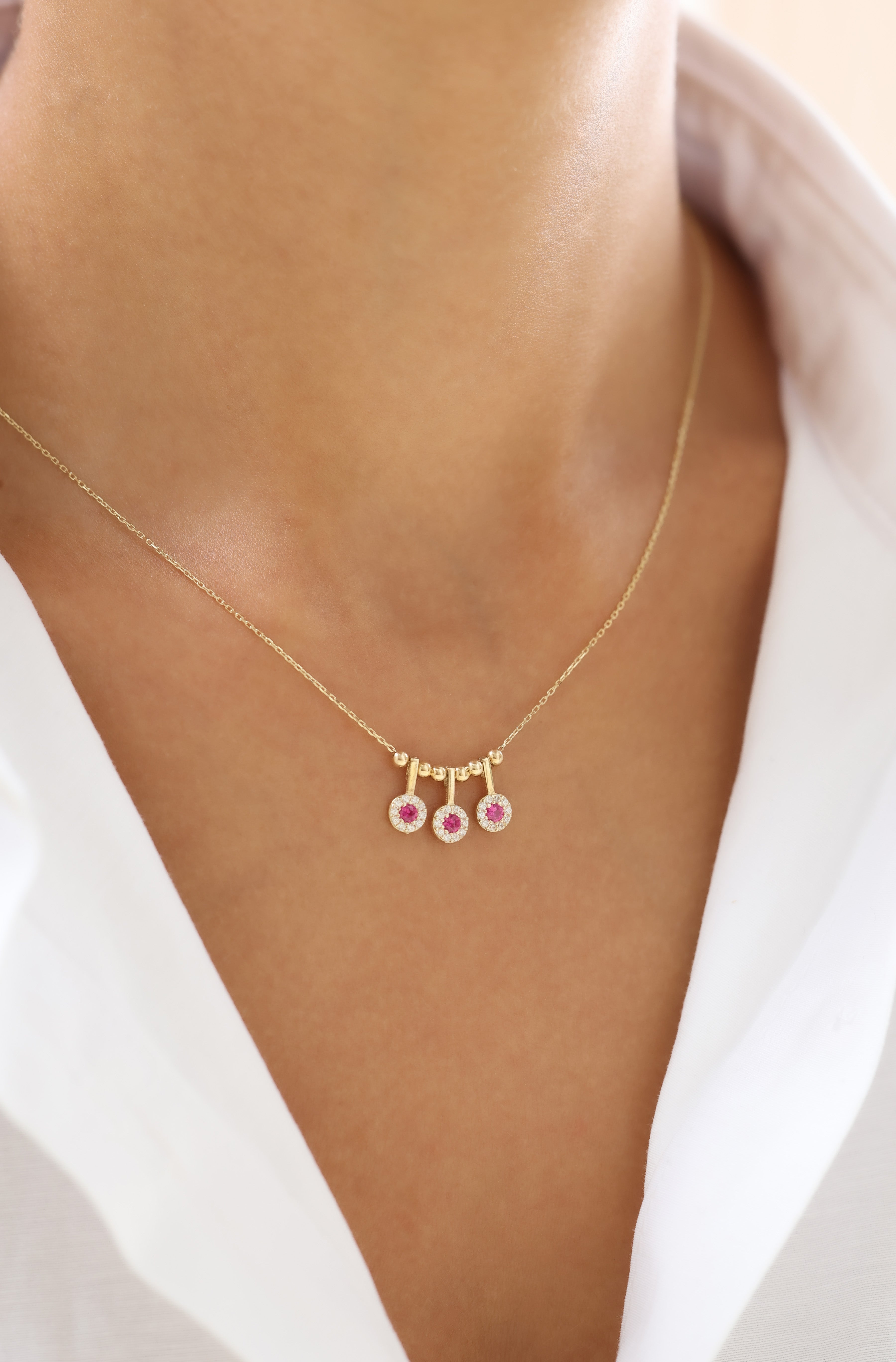 Üç ayrı yuvarlak formun zarif sallantısı, boyunda hareketli ama sofistike bir etki yaratıyor. Mor taşın romantik tonları ise feminen bir dokunuş katıyor.