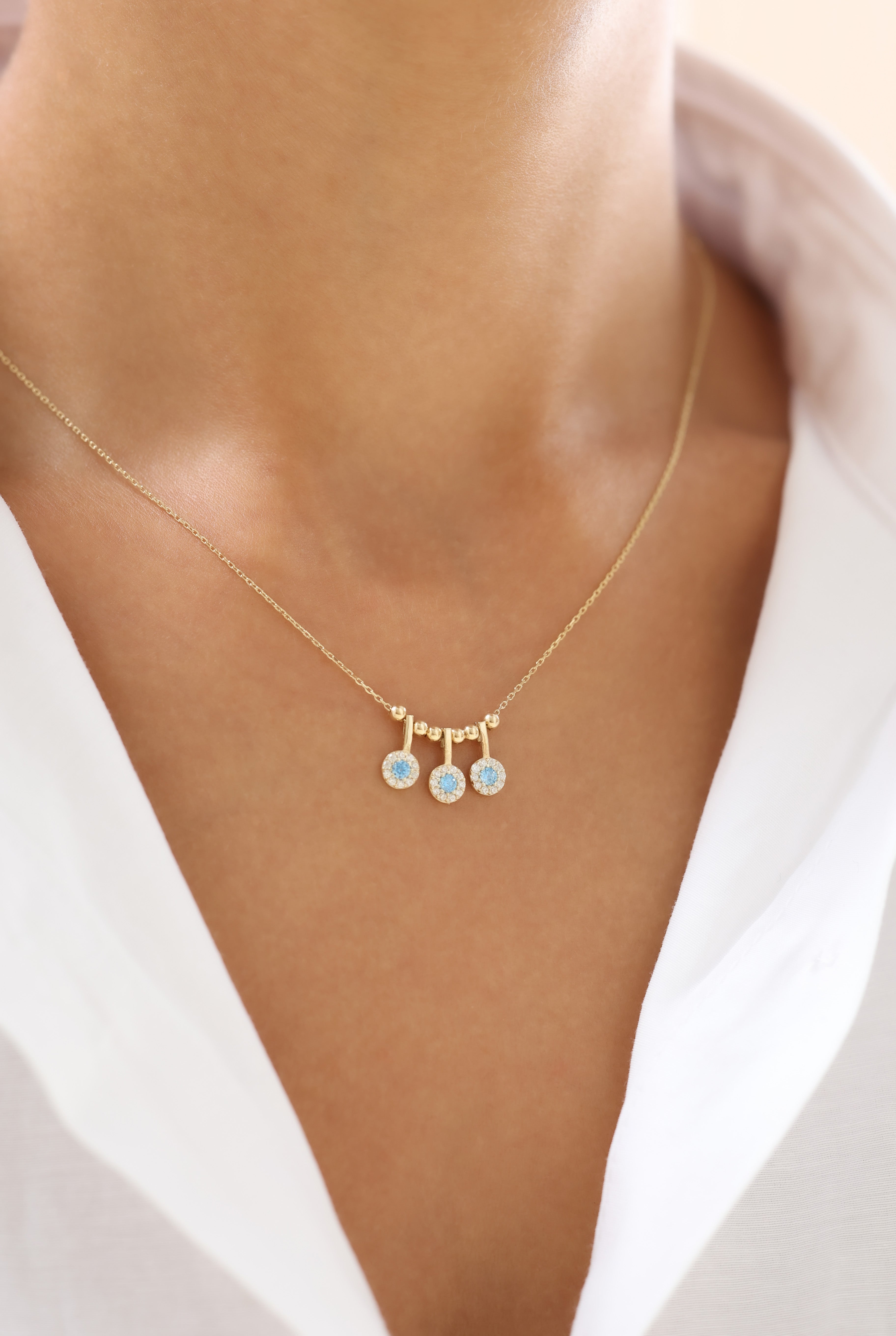 Yuvarlak Halkalı Mavi Taşlı 14 Ayar Altın Kolye, sade ama etkileyici tasarımıyla her stile uyum sağlar. Üç zarif halka formu, mavi taşların ferah ışıltısıyla birleşerek zarafet ve sakinliği aynı anda yansıtır.