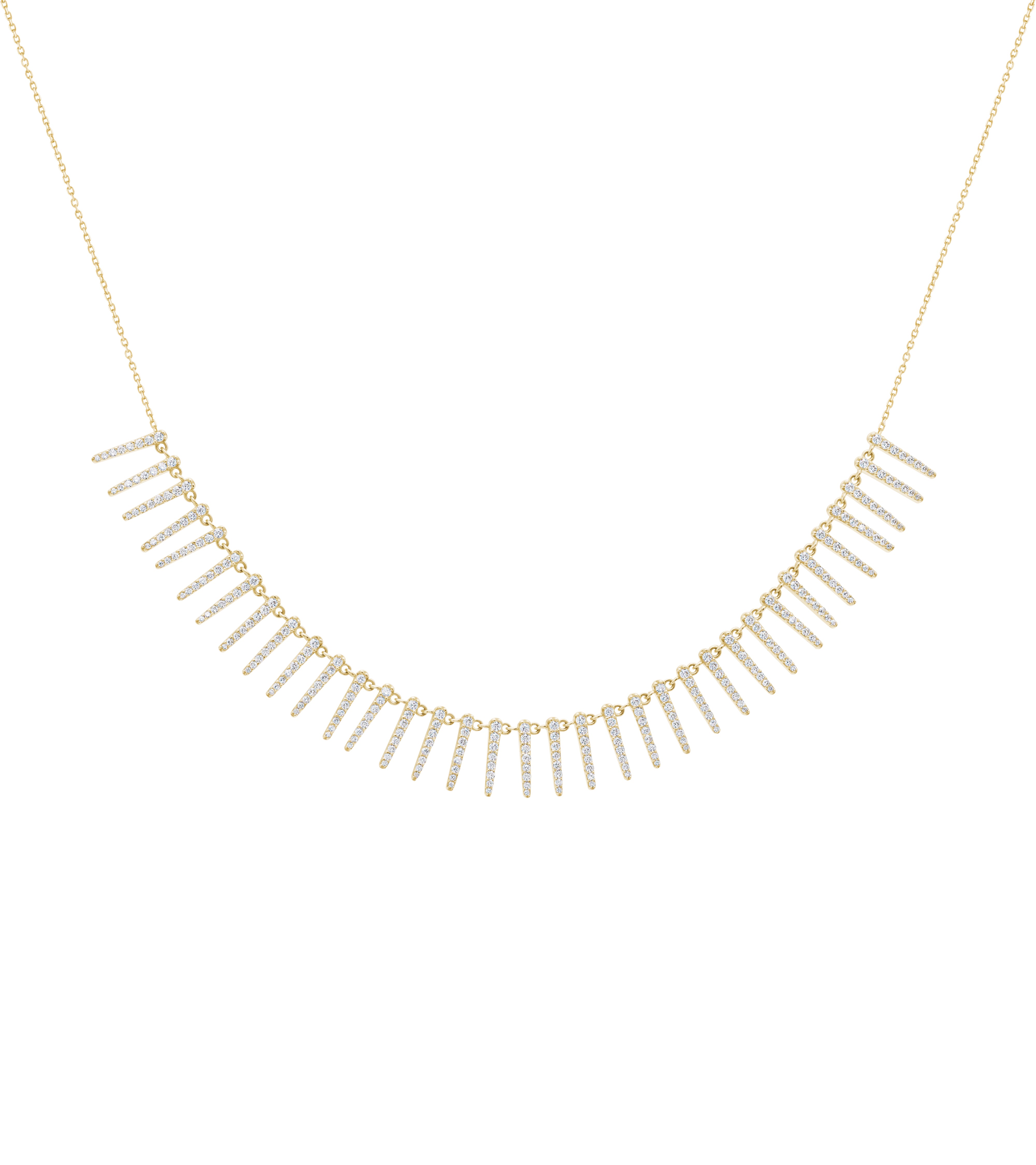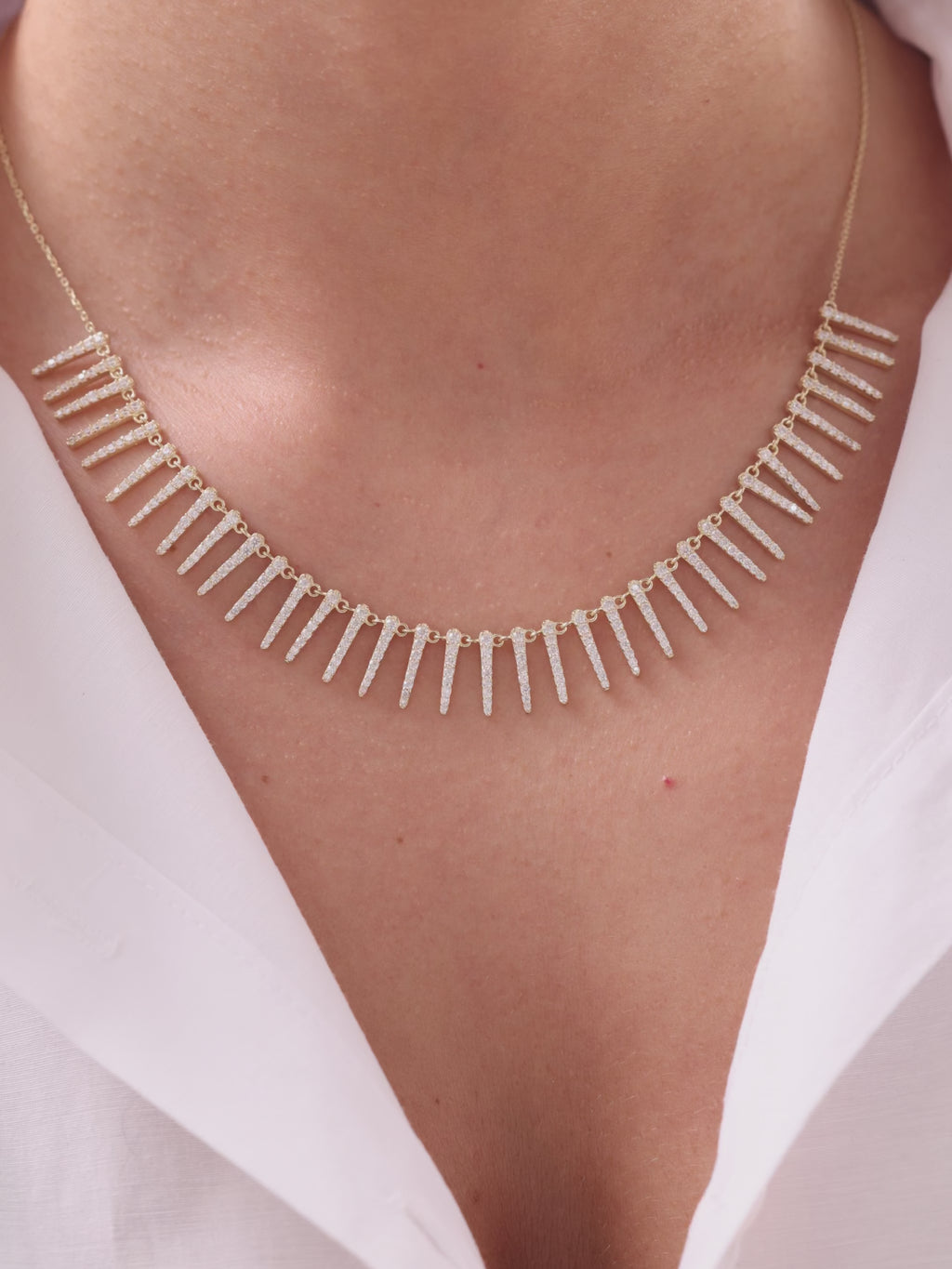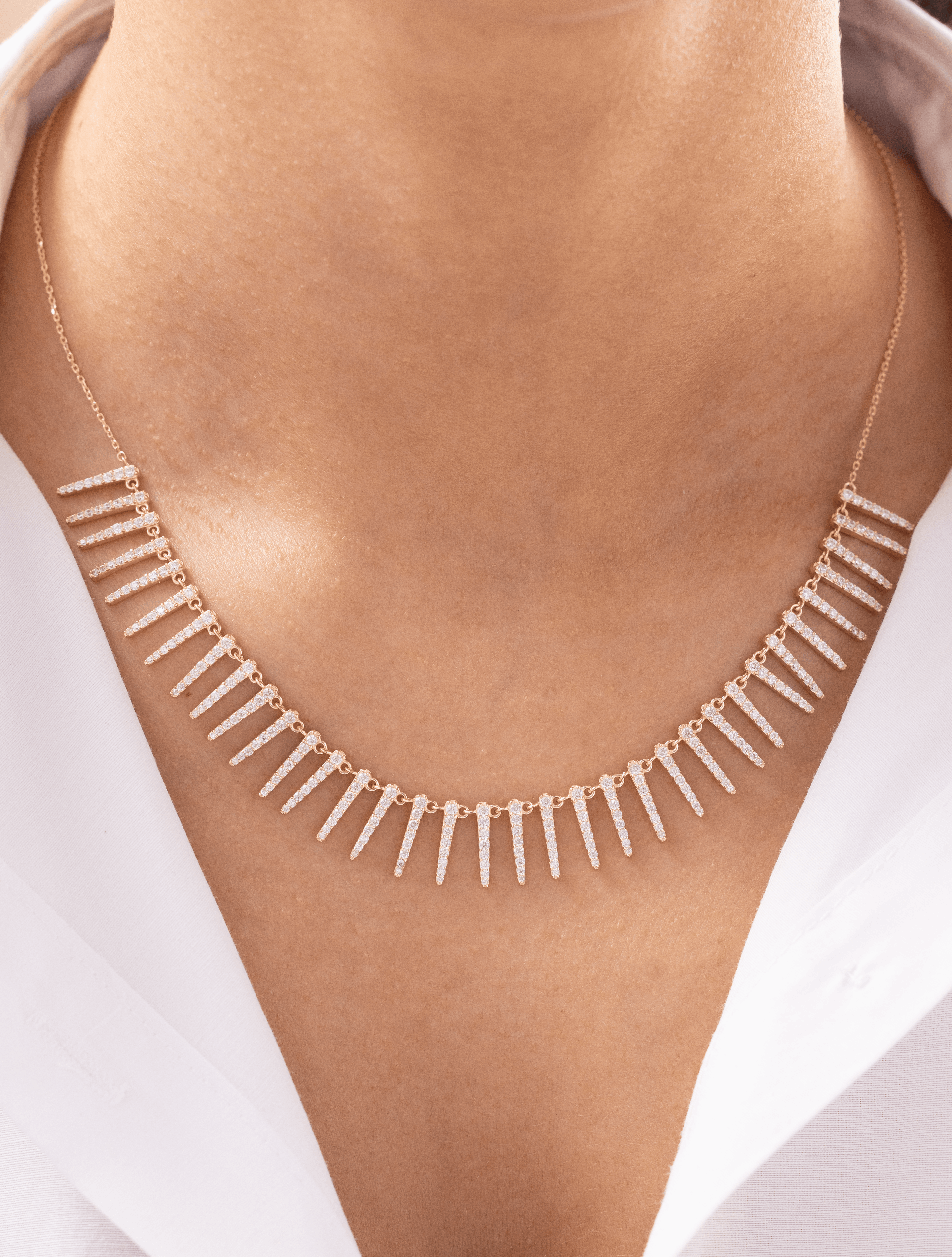 Sarkıt formu, boynun boyunca süzülen bir ışıltı gibi.