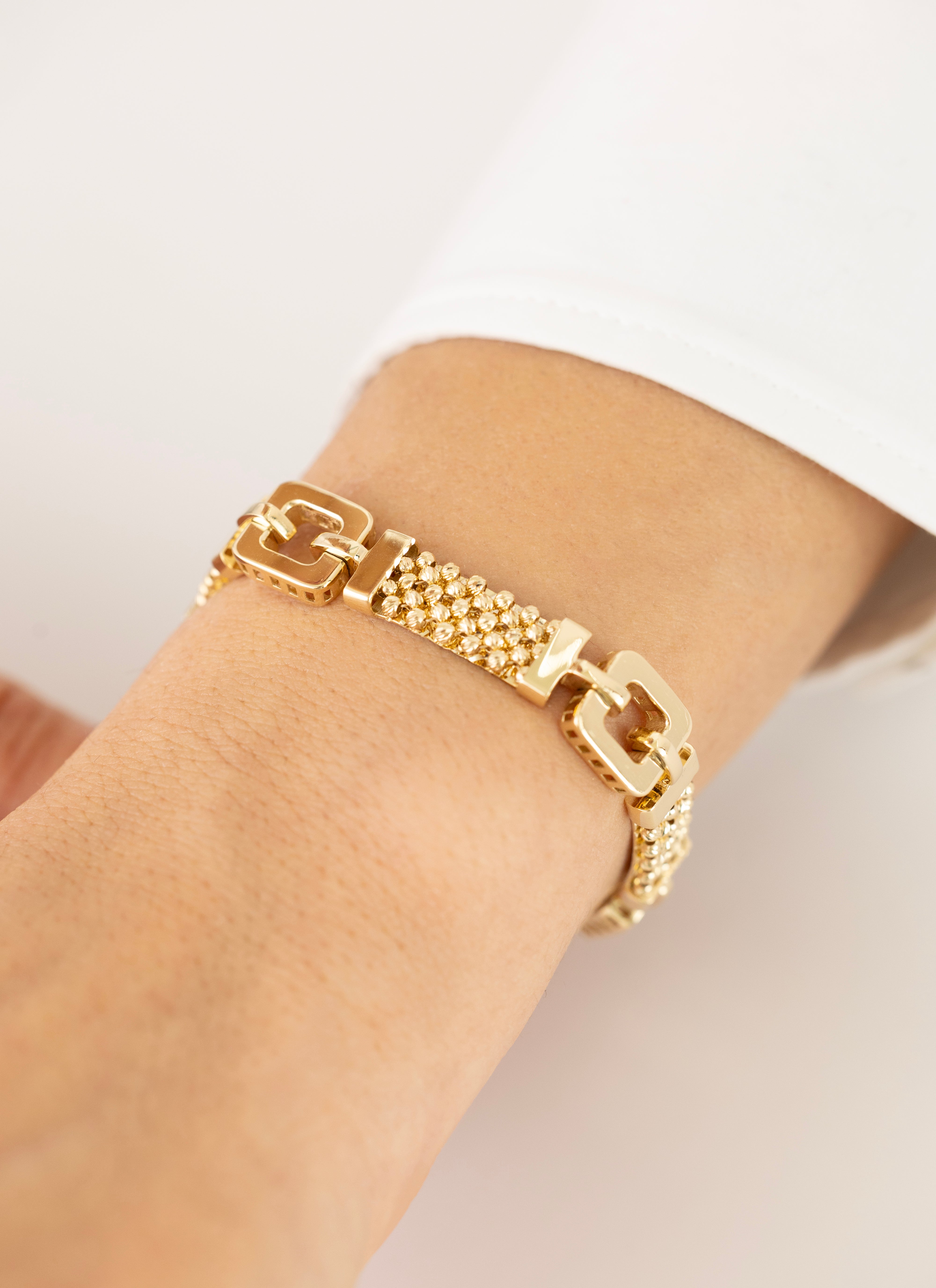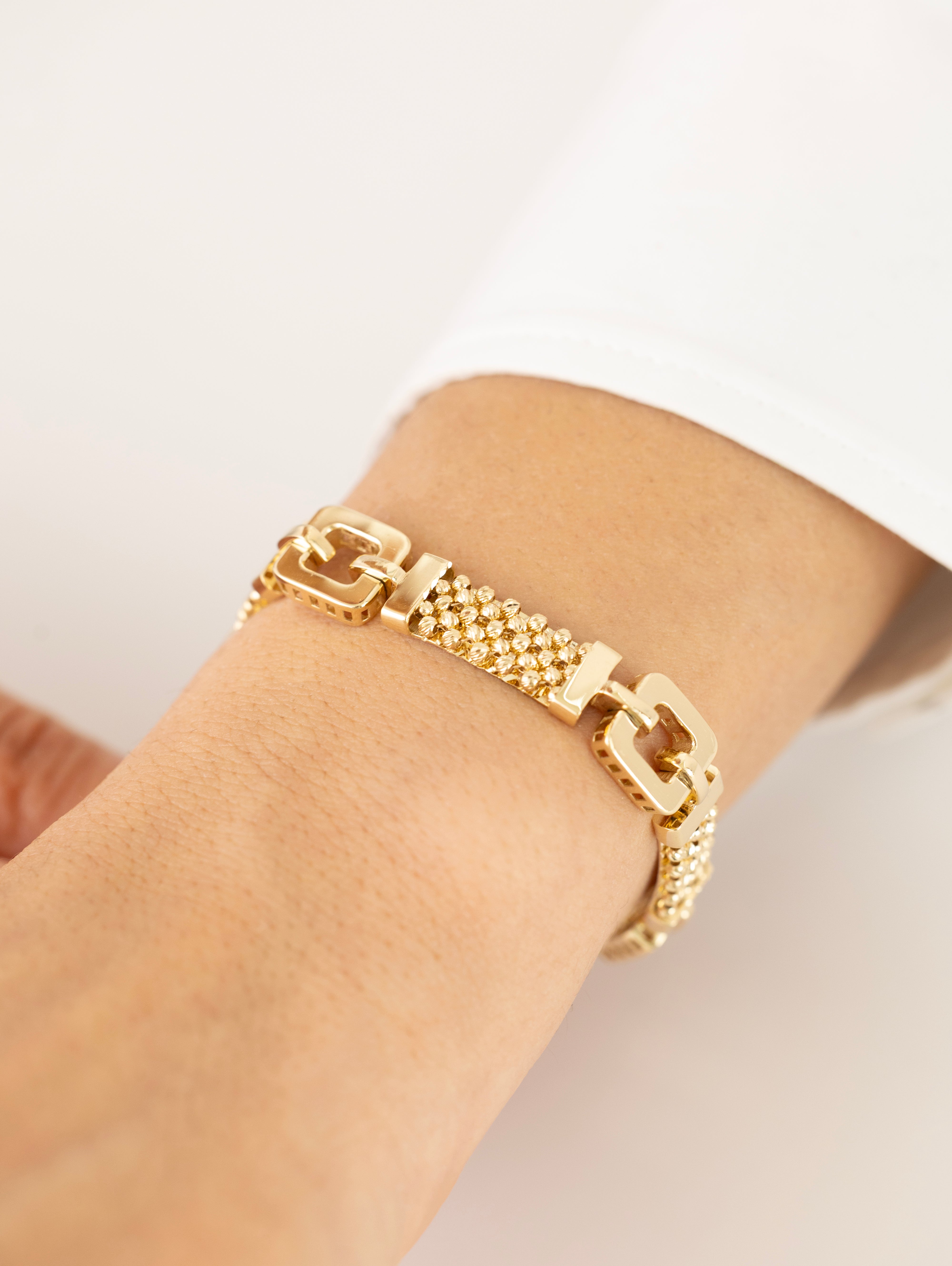 Geometrik formlu halkalar ve pırıltılı detayların uyum içinde bir araya geldiği Zincir Harmoni 14 Ayar Altın Bileklik, hem modern çizgileri hem de klasik ihtişamı bir arada sunar. Göz alıcı yapısı sayesinde güçlü bir stil ifadesi yaratır.